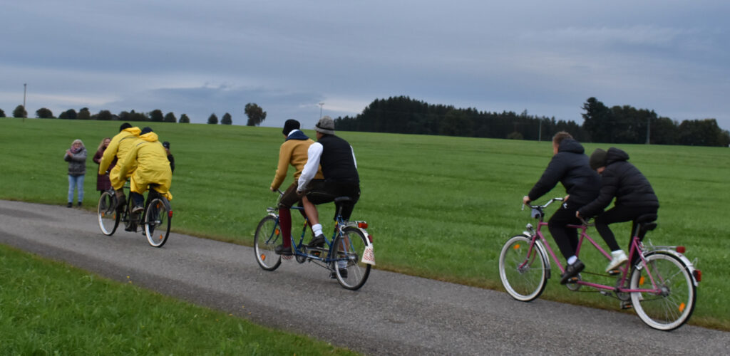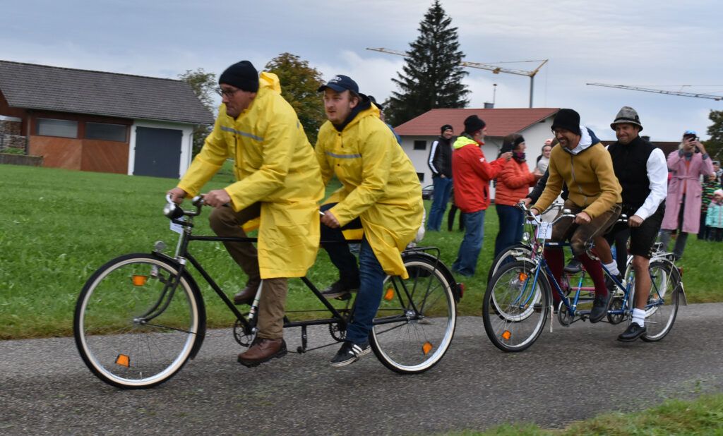 Dann ging es auf die leicht bucklige Strecke, irgendwo waren noch einige Heuballen zu überwinden, bevor die mutigen Radler wieder auf dem Feldweg bei der Antonius-Kapelle nach Wielazhofen zurückkamen. Nun musste man nur noch den Buckel hinauf zum Rottmar-Hof, wo das Ziel eingerichtet war. Zuschauer am Wegesrand feuerten die Radler an. Manche kamen in rasantem Tempo an, schwer schnaufend, manch einer ließ sich Zeit, denn die Gaudi war die Hauptsache bei diesem Rennen. Es waren sogar sieben Tandem-Räder dabei und so mancher Radler hatte historische Klamotten an oder kam sogar in Tracht mit weißem Hemd und Hut.