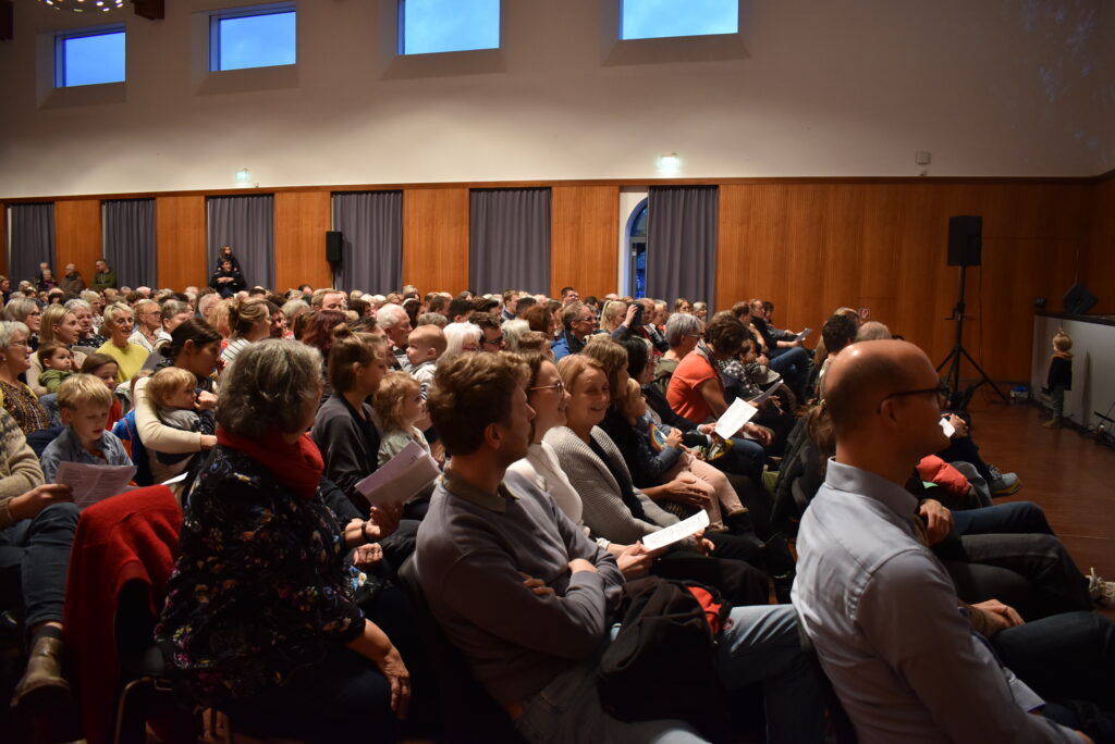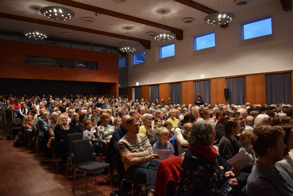 Leutkirch – Am 4. Adventssonntag lud die Chorgemeinschaft St. Martin in Leutkirch zu einem Familien-Mitsing-Konzertnachmittag ein, genannt „Coming home for christmas“. Die Festhalle füllte sich derart schnell, dass bald weitere Stühle aufgestellt werden mussten; an den Seiten standen die Besucher. Unter Beifall kamen erst die jüngsten Sänger/innen auf die Bühne, die “Martinsspatzen”; dann kamen der Jugendchor sowie die jungen Frauen des „Ensembles Vocal“ und stellten sich nebeneinander auf. Solosängerin Gertrud Hiemer-Haslach und Franz Günthner am Flügel komplettierten den Reigen der Auftretenden.