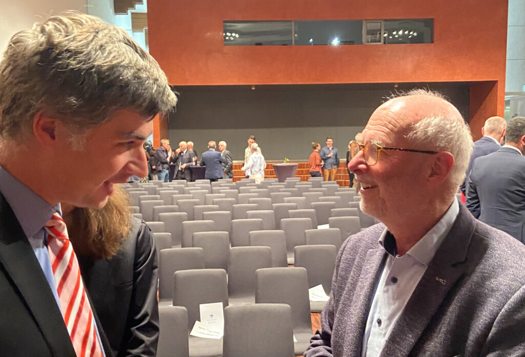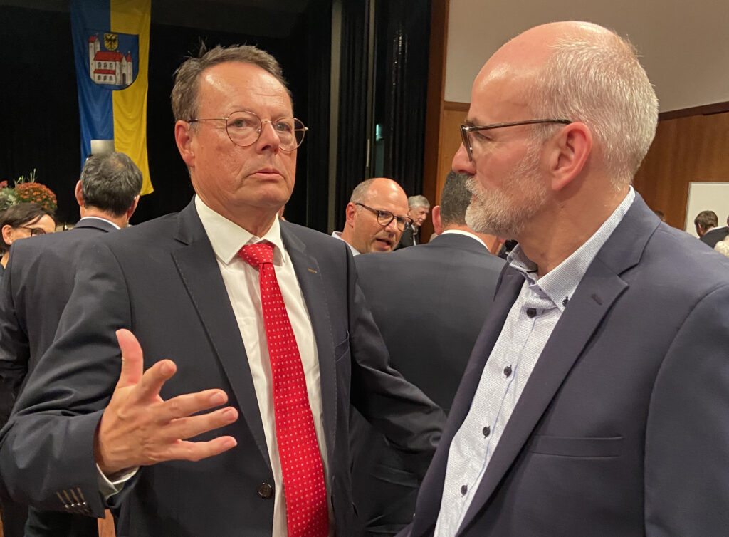 Gerhard Reischmann, Redaktionsleiter und Mitherausgeber der Bildschirmzeitung, im Gespräch mit dem gewählten und frisch vereidigten Finanzbürgermeister Prof. Dr. Daniel Gallasch.