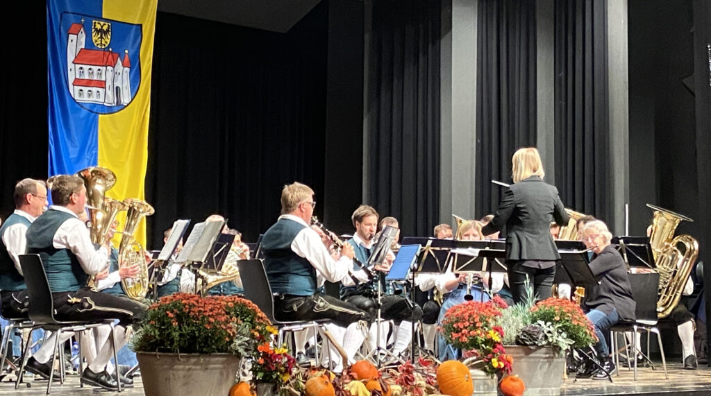 Die festliche Gemeinderatssitzung in der vollbesetzten Festhalle wurde mit Musikstücken der Stadtkapelle unter der Leitung von Emma Geser (Bild) mitgestaltet. Im Rahmen der Sitzung wurde die Diepoldshofener Künstlerin Dorothea Schrade durch den von Tübingen gekommenen Regierungspräsidenten Klaus Tappeser mit der Staufer-Medaille des Landes Baden-Württemberg ausgezeichnet.