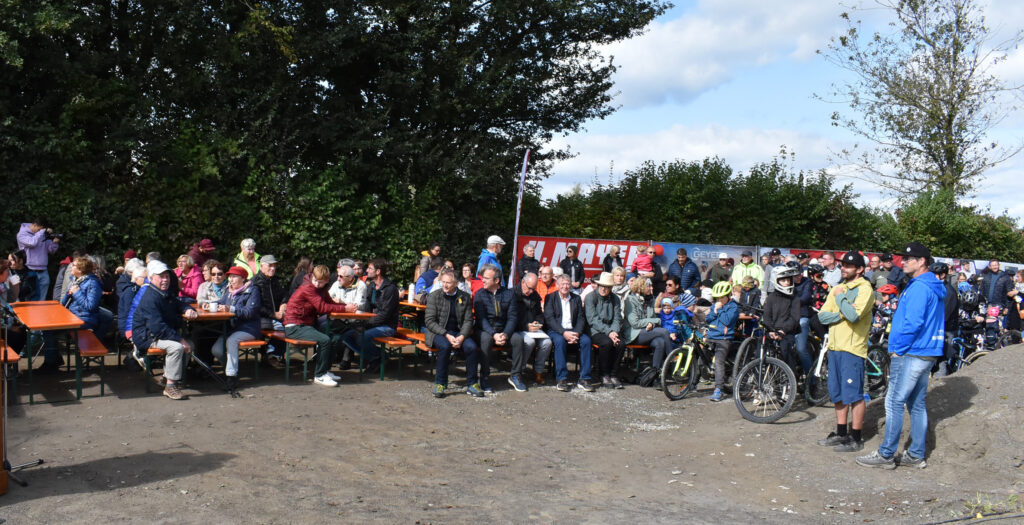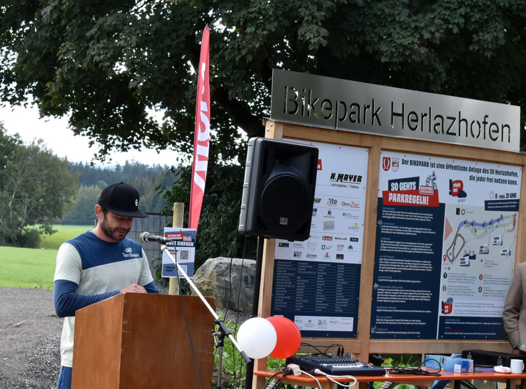 Es folgten die Grußworte zur offiziellen Eröffnung des Bikeparks, allen voran von Thomas Weber, dem Vorsitzenden des Herlazhofer Sportvereins (SVH). Er ging auf die Anfänge vor vier Jahren ein, damals noch in der Corona-Zeit, als die Idee vom Bikepark bei den Herlazhofer Sportstätten aufkam und diskutiert wurde. Schon bald fanden sich Menschen zusammen, die dafür brannten, besonders Christoph Roth, der sich sehr dafür einsetzte und viele begeisterte. Es wurde dann die SVH-Radsportabteilung gegründet. Weber betonte, dass der Bikepark nicht von der Stadt gebaut wurde, sondern vom SVH und die Mitglieder sich auch um die Pflege kümmern. Er dankte den vielen Sponsoren, die das große Projekt unterstützten und es gab viel Beifall.