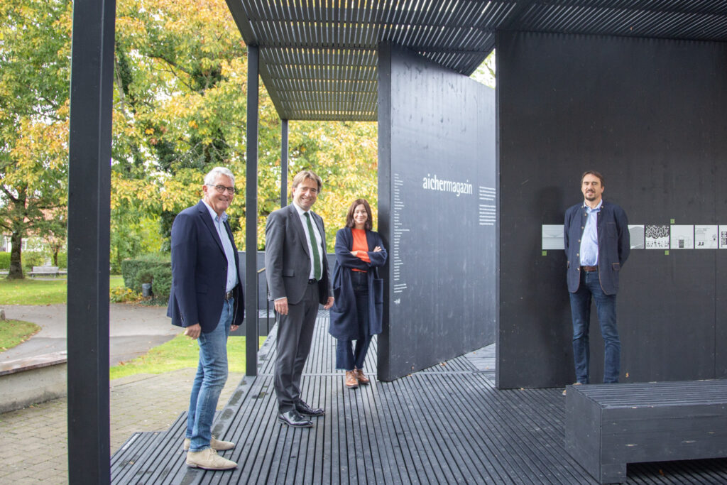 Michael Lang (Oberbürgermeister der Stadt Wangen im Allgäu) und Rainer Magenreuter (Bürgermeister der Stadt Isny im Allgäu) freuen sich, mit dem Umzug des aichermagazins auf die Landesgartenschau eine schöne Verbindung zwischen den beiden Allgäu-Städten zu schaffen. Auf dem Bild (von links nach rechts): Karl-Eugen Ebertshäuser (Geschäftsführer Landesgartenschau Wangen 2024 GmbH), Michael Lang, Karin Konrad (Geschäftsführung Isny Marketing GmbH) und Rainer Magenreuter. © IMG / Ch. Lang