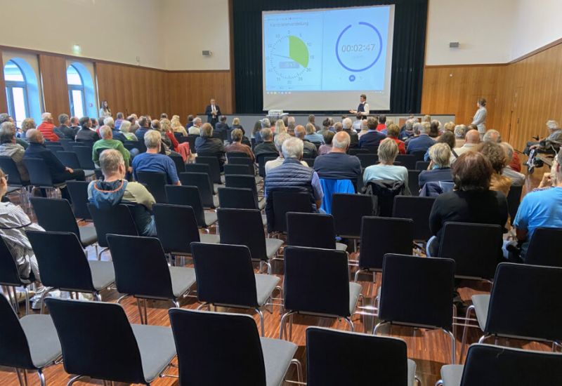 Nach einführenden Worten von Bürgermeisterin Christina Schnitzler leitet Kulturbeauftragter und Volkshochschulleiter Karl-Anton Maucher die Veranstaltung. Jeder der beiden Bewerber bekommt 15 Minuten Zeit, sich vorzustellen. Danach 20 Minuten Fragerunde aus dem Saalpublikum. Während der eine Bewerber in der Festhalle spricht, muss der andere in der Künstlergarderobe warten. Als erster ist Kandidat Franz Josef Natterer Babych aus Kempten dran.
