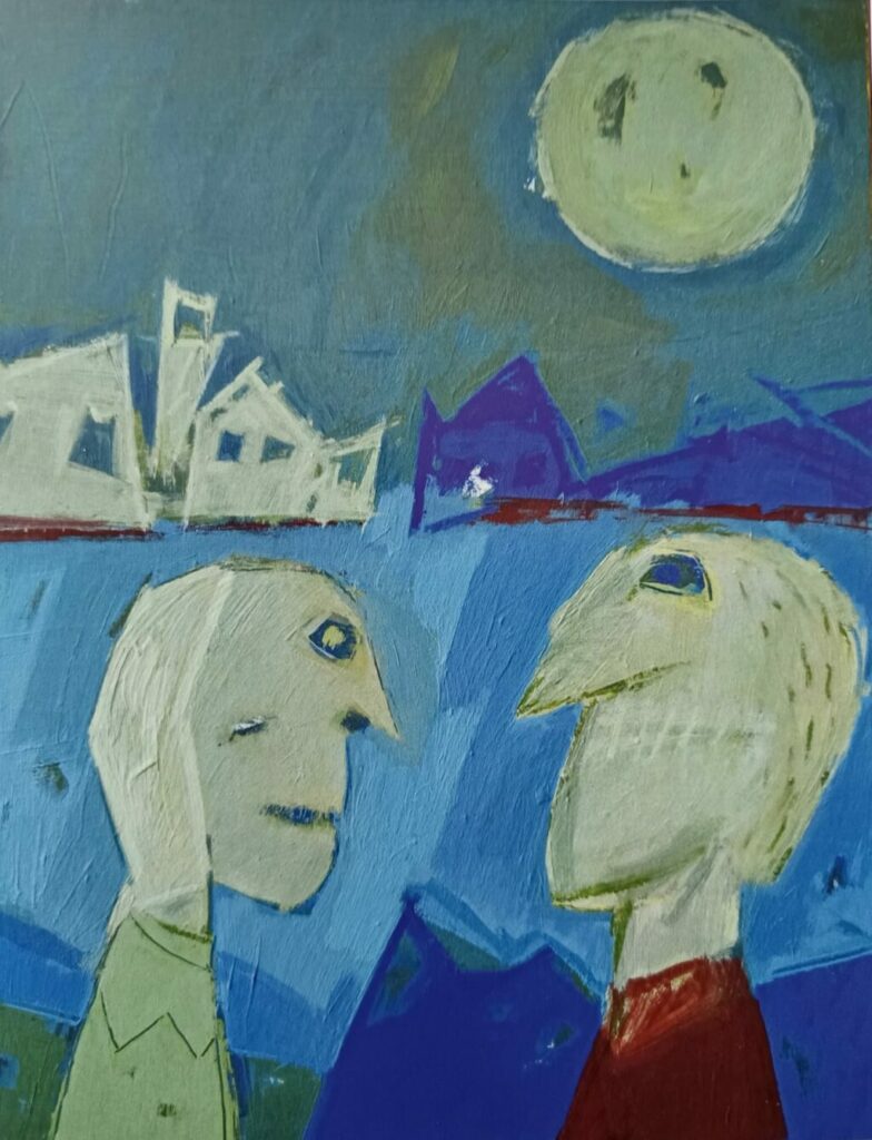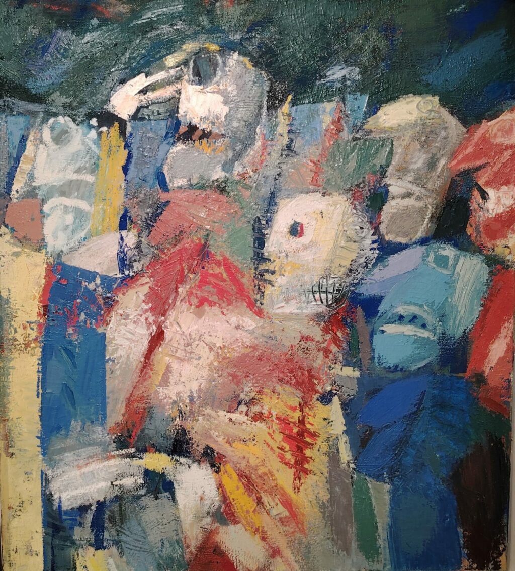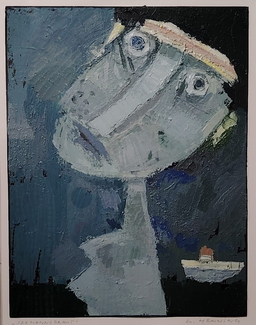 Den Schlusspunkt der Ausstellung bildet schließlich ein kleines Gemälde mit dem poetischen, aber auch rätselhaften Titel „Vollmond – Licht aus meines Vaters Land“. Im Katalog erläutert Wolfgang Henning, dass er hier vor allem über das Leben seiner Eltern im Dritten Reich nachdenkt. Unter der runden Mondscheibe steht sich ein Paar gegenüber. Im Hintergrund meint man eine Ruinenlandschaft zu erkennen. Wahrscheinlich erweist der Künstler hier seinem Vater, dem Maler Erwin Henning, dem er sich eng verbunden fühlt, seine Reverenz. In dessen sinnbildlicher Darstellung der Nachkriegszeit – sein Gemälde „Vision“ (1947) ist im Katalog abgebildet – irrt eine kleine Familie durch die Ruinen einer kriegszerstörten Stadt. Um sein Vollmond-Bild haben Wolfgang Henning und Ausstellungsmacherin Heike Frommer Werke versammelt, die, wenn nicht alles täuscht., einen versöhnlicheren Ton anschlagen wollen als etwa die bedrohlichen Gruppenbilder eine Etage höher. In seinem farbstarken „Vorwärts II“ zum Beispiel findet sich unter den vorbeidrängenden Gestalten zumindest eine, die den Betrachter anschaut. In anderen Bildern wenden sich die Figuren einander zu und treten in Austausch. Bleibt der rätselhafte Bildtitel, der auch als Motto für diesen letzten Raum gewählt wurde.