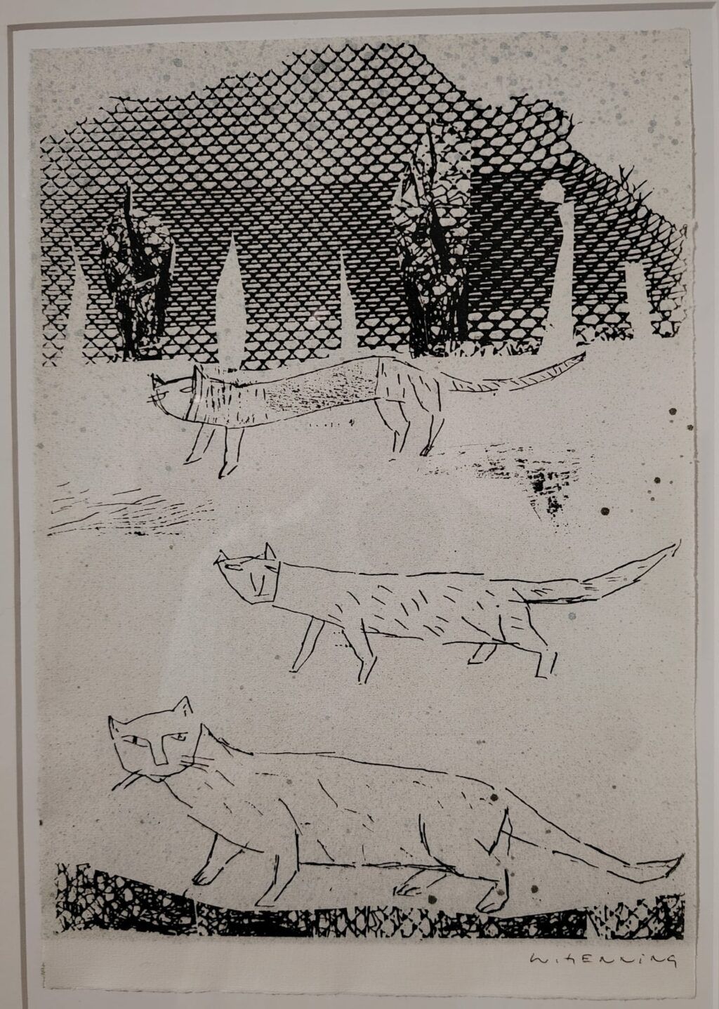 Zusätzlich gibt es noch einen kleinen Ausstellungsraum im Erdgeschoss. Den nutzt der Künstler zu so etwas wie einer Visitenkarte. Und die ist – wer vor zwei Jahren Hennings Ausstellung in Langenargen gesehen hat, wundert sich nicht – den Katzen gewidmet. Denen traut der Künstler offensichtlich fast eher über den Weg als den Menschen. „Das sind Geschwister von mir geworden“, wird er hier zitiert. In der bebilderten Biografie im Treppenhaus erfährt der Besucher sogar ihre Namen, die häufig aus Mozarts Oper „Die Zauberflöte“ stammen: Papageno, Tamino, Sarastro. Wolfgang Hennings Katzen-Bildnisse – als solche kann man sie ohne Weiteres bezeichnen – haben dabei nichts Verniedlichendes. Er zeigt bewusst auch die andere, raubtierhafte Seite der geliebten Hausgenossen.