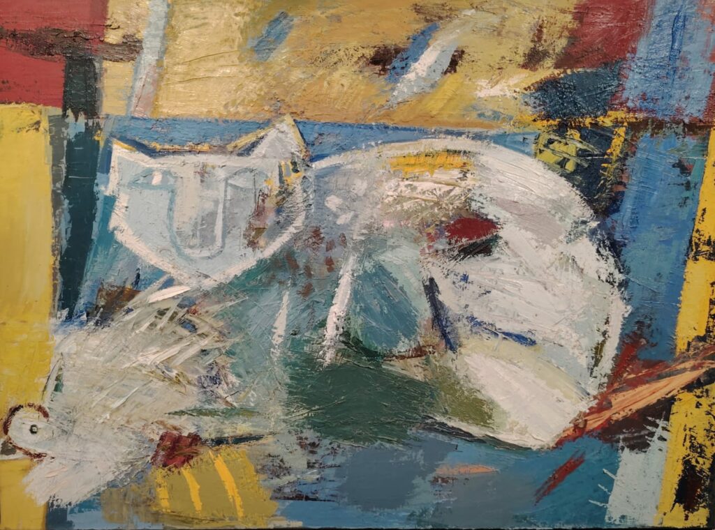Aber in der Ausstellung geht es auch noch um anderes. „Von Katzen, Engeln und anderen Menschen“ ist ihr genauer Titel. Und mit Engeln hat man es dann in einem weiteren Raum zu tun. Seit 1986 schenkt der Künstler seiner Frau Eva jedes Jahr zu Weihnachten ein kleines Gemälde mit einem Engel. Diese Arbeiten bilden den Kern dieses Kapitels der Schau. Man begegnet hier tatsächlich – ganz anders als bei den Jägern – sehr zugewandten Wesen, die dabei durchaus recht menschliche Schwächen haben können. Hier lohnt auch der Blick auf die stets poetischen, manchmal humorvollen Bildtitel. So kann man zum Beispiel lesen „Alles, was er mit seinen Flügeln berührt, erblüht“ oder “Zerzaust, zu dick, aber standhaft verkündet der Engel – Friede sei mit Dir“.