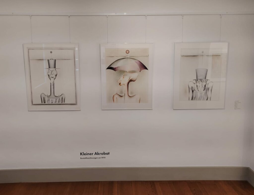 Oben im zweiten Stockwerk beginnt die chronologische Abfolge von beispielhaften Werkgruppen aus mehr als einem halben Jahrhundert. Den Auftakt bilden perfekt gemachte Bleistift- und Buntstiftzeichnungen aus den Jahren um 1970, in einem Stil, der für die Zeit sehr typisch ist. In feinsten Farbübergängen und Grauabstufungen werden phantastische Gestalten gezeigt. Die Gesichter erinnern dabei manchmal an Tierschädel. In diesen Arbeiten ist die Auseinandersetzung des Künstlers mit der Kunst des Surrealismus und der Pop Art unübersehbar.