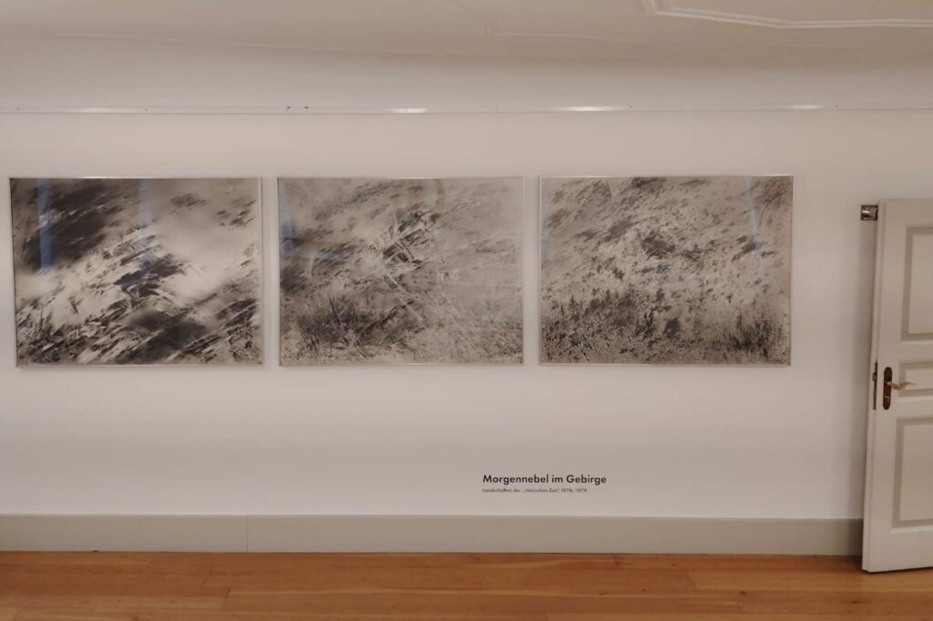 Der nächste Raum bringt dann einen harten Bruch. Der Zeichenstil des Künstlers hat sich vollkommen verändert. In den 1970er-Jahren hatte Wolfgang Henning an der Kunstakademie Karlsruhe studiert. Die neuen Arbeiten – in Meersburg finden sechs der insgesamt sieben großformatigen Blätter der Serie Platz – entstanden dann 1978/79 während eines einjährigen Stipendienaufenthalts in der Villa Massimo bei Rom. Der Künstler verwendet nun offensichtlich sehr weichen Bleistift. Das Papier wird mit heftigen Bleistiftstrichen geradezu traktiert. An vielen Stellen verdichten sich die breiten Striche zu tiefem, glänzendem Schwarz. Zuerst sieht man in dem Blatt nur gänzlich ungegenständliche, abstrakte Strukturen. Das ändert sich, wenn man den Titel des Zyklus liest, „Morgennebel im Gebirge (nach C. D. Friedrich)“. Man erkennt jetzt Berge, schroffe Felsformationen oder auch Tannenspitzen. Offensichtlich hat den Künstler damals in der Sonne des Südens die Sehnsucht nach dem Norden und nach der Malerei der deutschen Romantik gepackt.