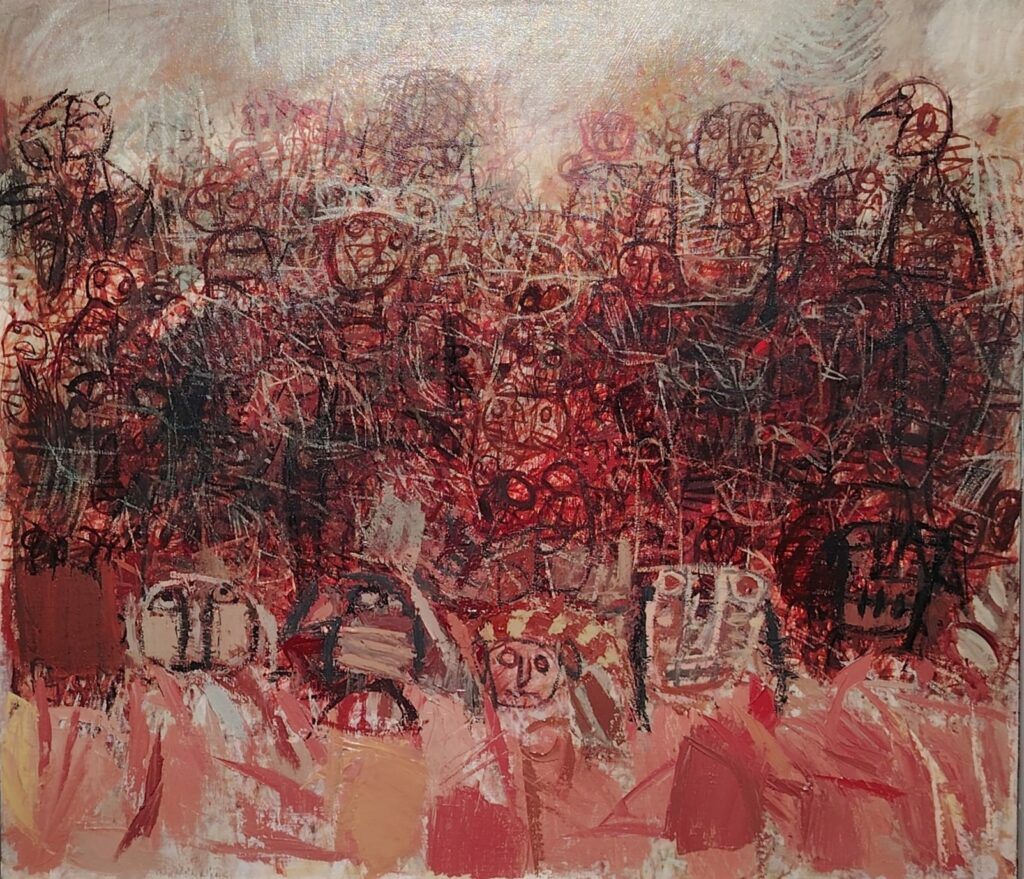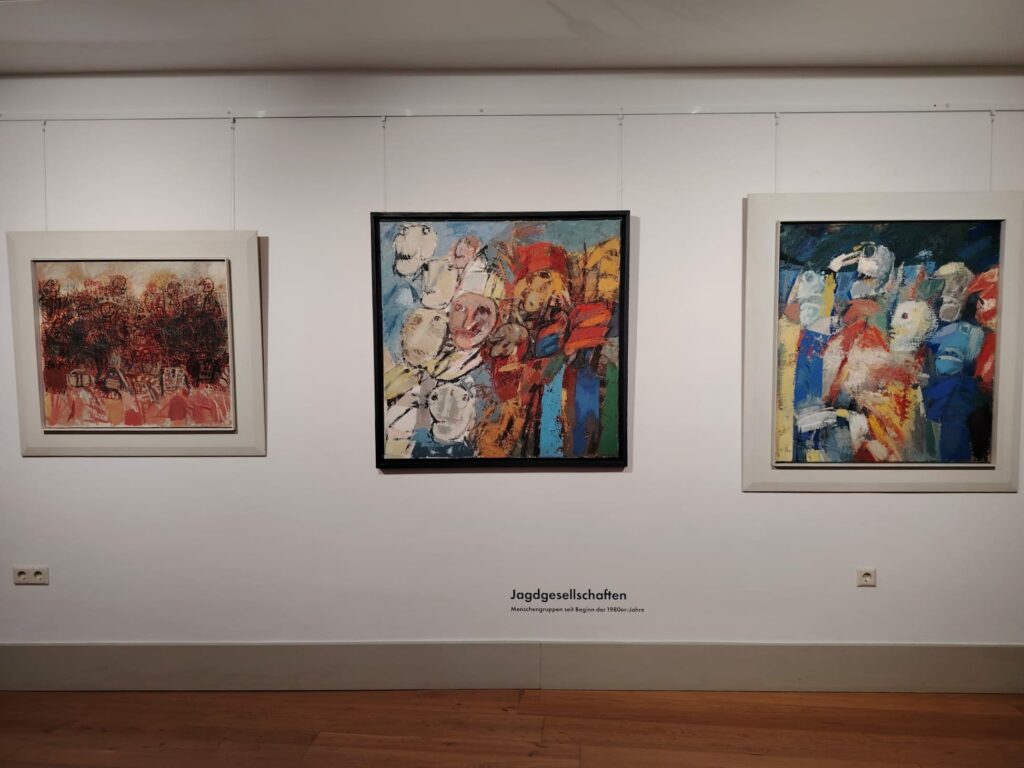 Ein wichtiger Themenkreis in der Ausstellung und im Werk des Malers überhaupt sind dicht gedrängte Menschengruppen. Groteske, maskenhafte Gesichter drängeln sich da vor dem Betrachter. Diese Werkblöcke heißen dann „Schaulustige“, „Versammlung der Lampenanzünder“ oder „Jagdgesellschaften“. Wolfgang Hennings „Jagdgesellschaften“, deren Personal meistens nach links aus dem Bild läuft, zeigen aber nicht entspannte Jäger nach erfolgreicher Jagd. Der Künstler thematisiert die Hatz selber. Wohin sich die Figuren bewegen oder hinter wem sie her sind, will man dann so genau gar nicht wissen. „Ich empfinde Menschenmassen seit jeher als bedrohlich“, wird der Künstler hier zitiert. In Zeiten, in denen sich immer häufiger ein Mob Gleichgesinnter zusammenfindet und sich dann lautstark, manchmal auch gewalttätig, Gehör verschafft, sind diese Werke von einer erschreckenden Aktualität. Meistens zeigt der Maler dabei nicht die ganze Figur. Der Kopf steht als Kürzel für das Ganze, so auch in seinen Einzelbildnissen oder in der Werkgruppe „Im Hause der Frau Merkel“, wo die Köpfe wie in einem Setzkasten gestapelt sind.