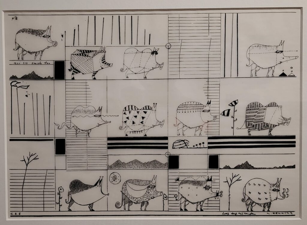 Beim Thema Engel, da kommen einem natürlich auch die Arbeiten von Paul Klee in den Sinn. Überhaupt hat Wolfgang Henning eine Nähe zu dem Schweizer. Im Katalog widmet Heike Frommer, die Leiterin des Roten Hauses, diesem Zusammenhang denn auch einen eigenen Beitrag. Ganz ausdrücklich auf Klee bezieht sich der Künstler in einer Serie von Tuschezeichnungen, die in einem eigenen Kabinett gegen Ende der Ausstellung präsentiert wird. Ausgehend von einer kleinen Zeichnung Klees mit einem Schwein, erfindet er eine ganze Geschichte, „Die Briefe des Eurylochos“, die dann in der Abfolge der Blätter fast wie in einem Comic erzählt wird. Gerade an dieser Werkgruppe erweist sich einmal mehr Wolfgang Henning als das, was man in alten Zeiten einen „Pictor Doctus“ genannt hätte, einen gebildeten Maler, einen Künstler, der viel weiß, viel gelesen hat. Hier spinnt die Story eine Begebenheit aus Homers Versdichtung „Odyssee“ weiter. Auch eine Komposition von Johann Sebastian Bach – wiederum vermittelt durch Klee – spielt eine Rolle. Aber das alles muss man gar nicht wissen, um seine Freude zu haben an der Geschichte und an den liebevoll geschilderten Gestalten.