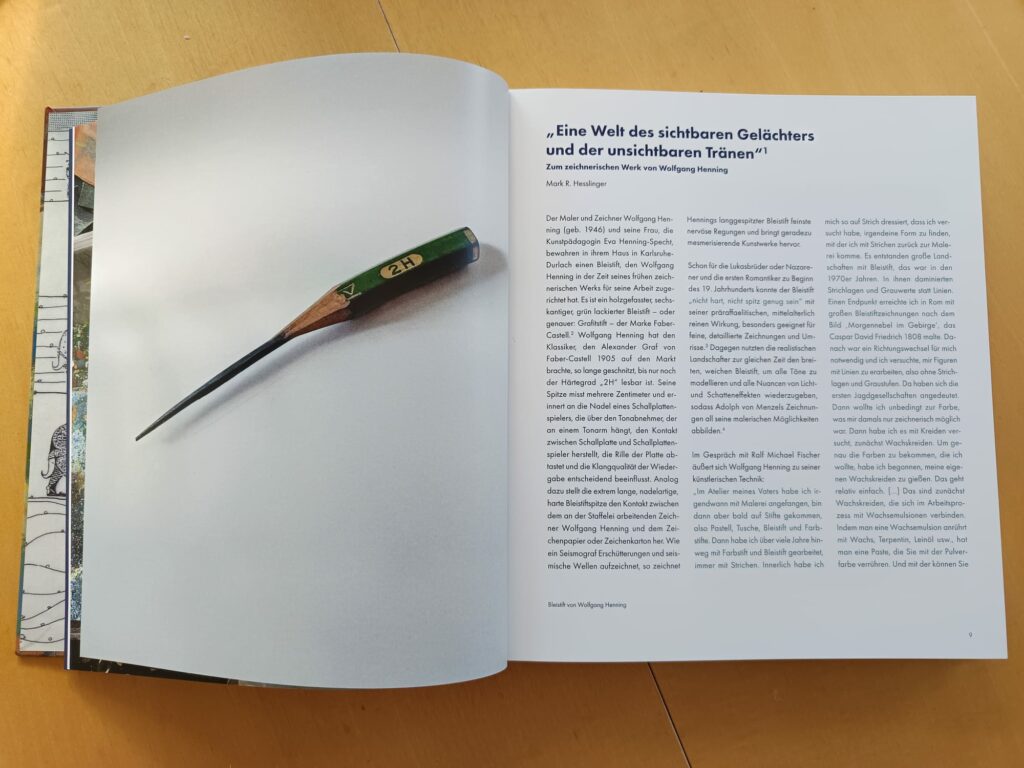 Viele Bilder gehen einem noch durch den Kopf, wenn man nach dem Ausstellungsbesuch die Freitreppe zum Schlossplatz hinabsteigt. Wenn man Glück hat und das Katalogbuch zur Ausstellung erworben hat, kann man sich zuhause weiter mit dem Künstler beschäftigen. Das schön gemachte Buch ist nämlich kein gängiger Ausstellungskatalog mit den üblichen Textbeiträgen der Fachleute. Die gibt es natürlich auch. Im über 70 Seiten umfassenden Bildteil meldet sich Wolfgang Henning dann aber selbst zu Wort und denkt über seine Bilder nach oder ordnet ihnen hin und wieder den kurzen Text eines Dichters zu. Nach anregenden Seherlebnissen in der wohldurchdachten Bilderschau erwarten einen nun also noch weitere spannende Einblicke in die Gedankenwelt des Malers.