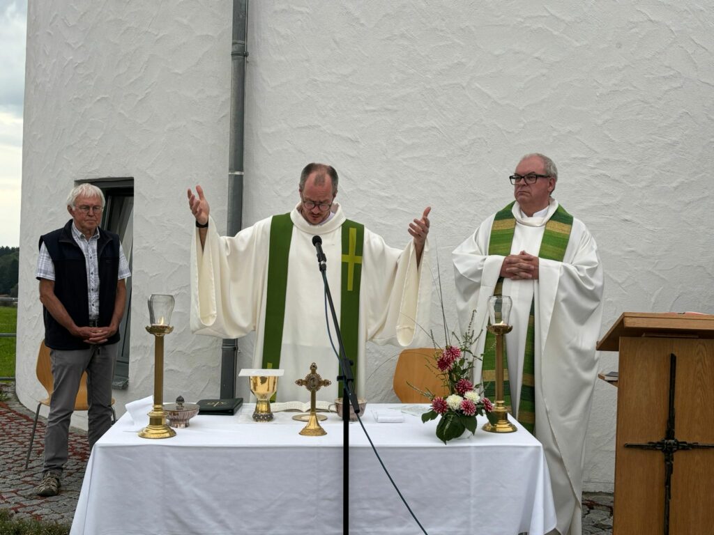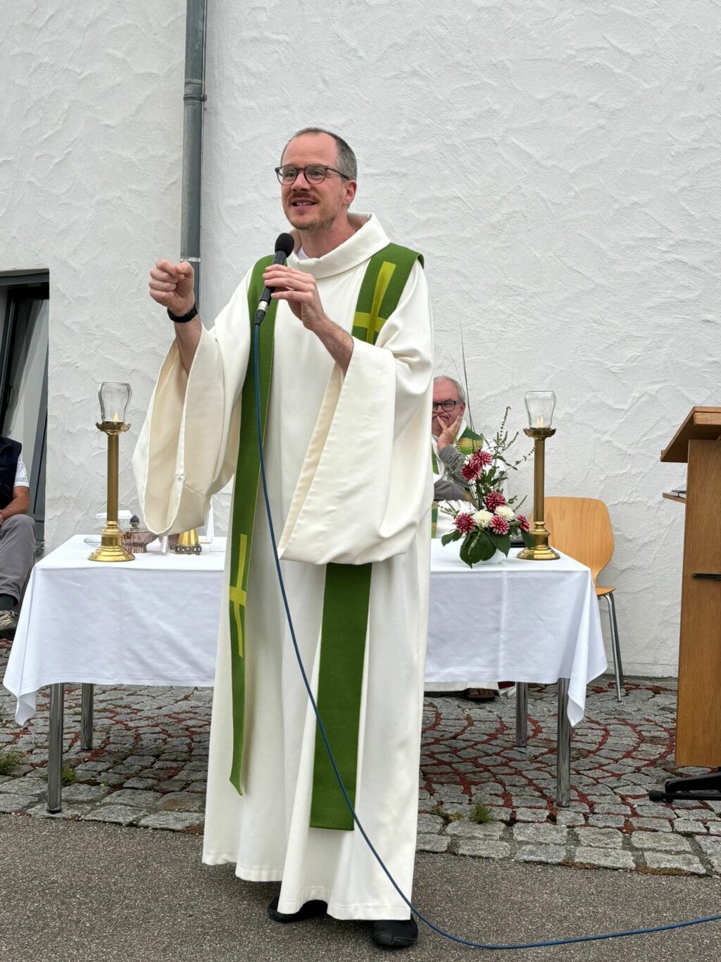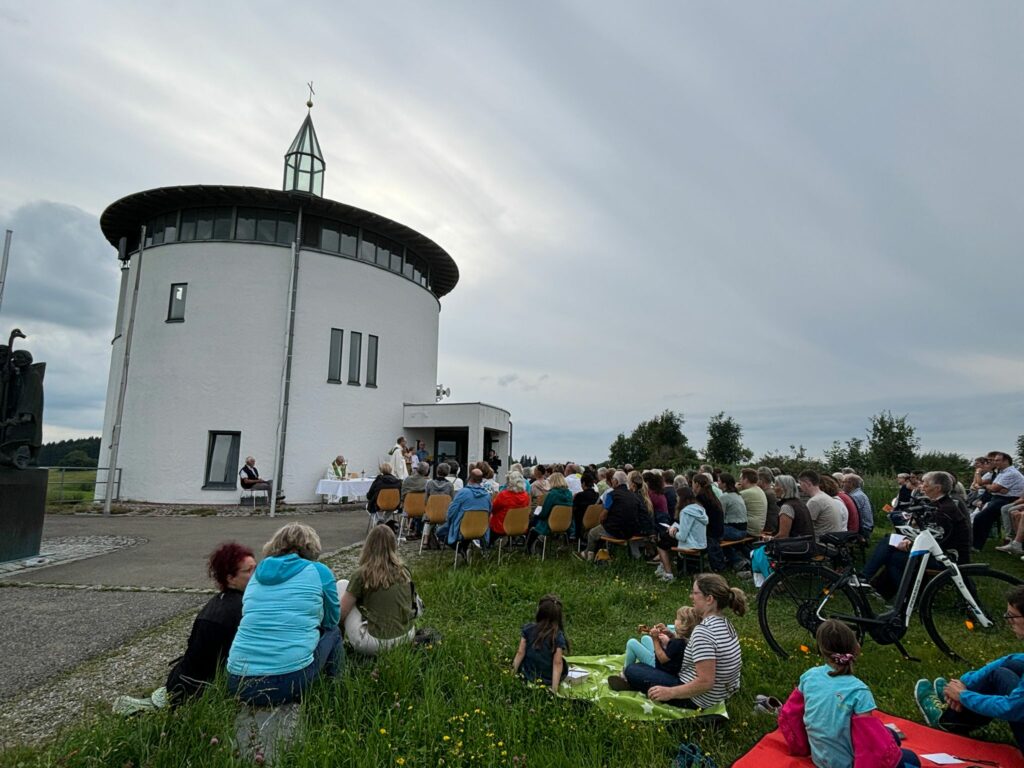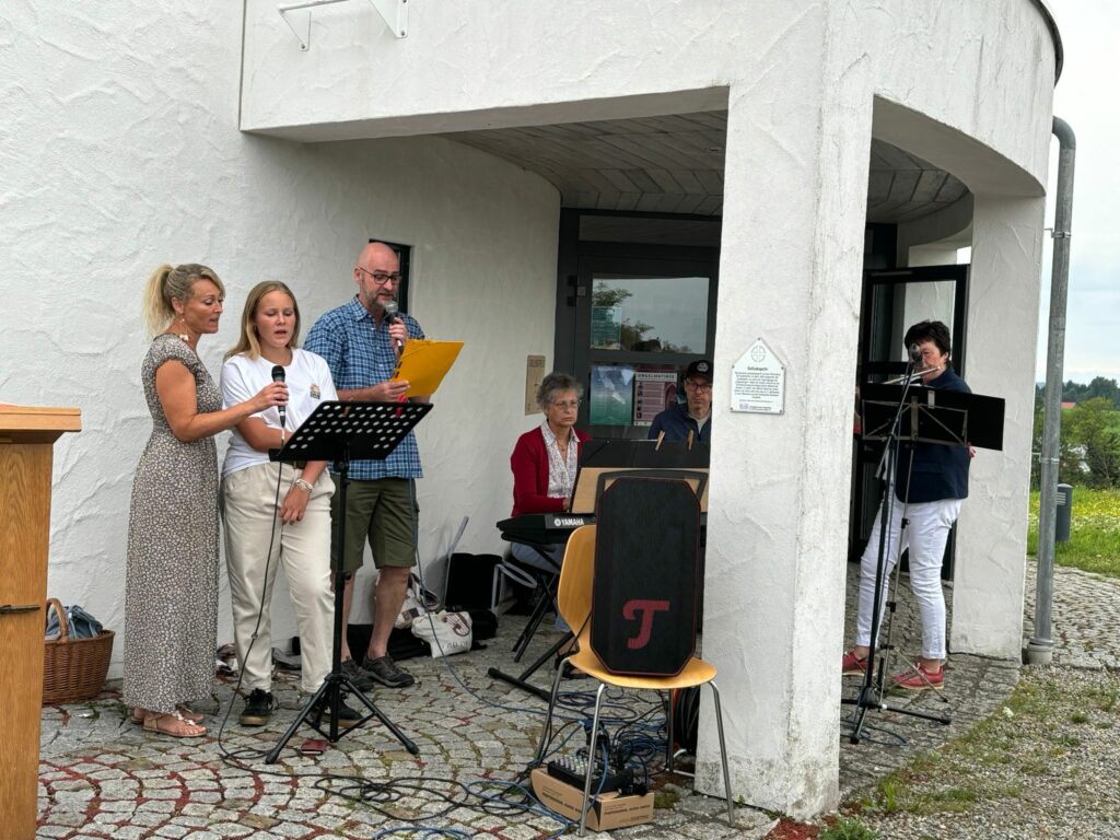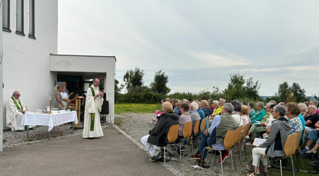 Tautenhofen – Ein lauer Sommer-Sonntagabend, Heuduft liegt in der Luft, weit mehr als 100 Menschen fanden sich an der Galluskapelle zum Open Air-Gottesdienst ein. Es hat schon Tradition und viele Besucher sind Stammgäste. So auch der Heggelbacher Seelsorger und Buchautor Wolfgang Metz, der zum alljährlichen Open Air-Gottesdienst in seinem Allgäu-Urlaub an oder in der Galluskapelle einlädt. Mit dabei ist auch immer Monika Heinz, die für die musikalische Umrahmung sorgt. Selber an der Querflöte, waren da noch zwei Musiker an Piano und Cajon, sowie drei SängerInnen, die mit Musik und Gesang dem Godi seine spezielle Note gaben.