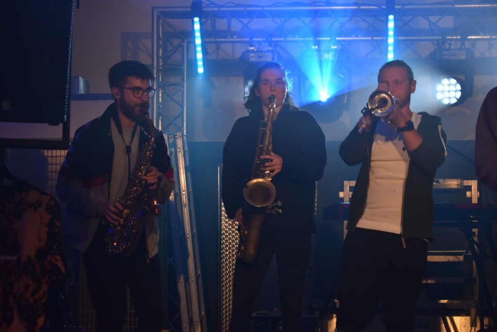 Und es gab ordentlich was auf die Ohren. „Alles dreht sich” sang die Nürnberger Gruppe “Skyline Green” (Bild) in einem der Säle im Brauhaus. Sie brachte dabei allerhand Rohre zum Tönen – geblasen von Saxophonistin Anne Brand. Mal schmetterte die fest-freudige Franken-Combo schnell tanzbare Blasmusik wie auf einer Balkan-Party. Mal erklang hitzig Latin-Rock. Mal kamen ihre Lieder im Ska – also irgendwo zwischen Reggae für Holzfäller und Tango für Transportarbeiter. Das Publikum im dicht gedrängt nebligen Saal spendete heftig Applaus.
