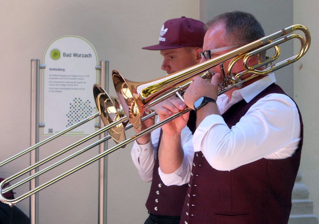 Bad Wurzach – Am vergangenen Sonntag, dem Hochfest der beiden Apostel Petrus und Paulus (29.6.), gab es bei bestem Sommerwetter bei der Gottesbergkapelle ihnen zu Ehren einen ganz besonderen Festgottesdienst unter freiem Himmel: Nach monatelanger Vorbereitung wurde von einem 80-köpfigen Projektchor gemeinsam mit der Stadtkapelle wie bereits zum St. Verena Kirchenfest vor zwei Jahren die „Missa Katharina“ von Jacob de Haan aufgeführt. Eingeladen zu diesem zentralen Gottesdienst waren Gläubige und Musizierende aus der ganzen Seelsorgeeinheit.