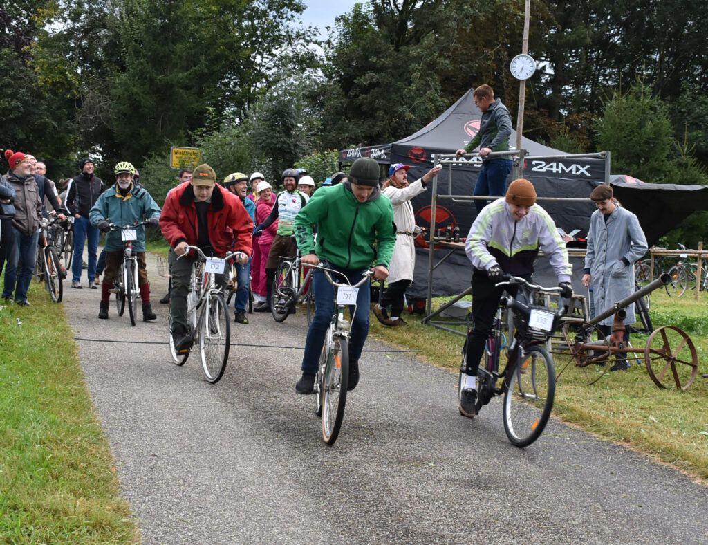 Wielazhofen – Freitagabend, 17.30 Uhr – noch ist es ganz ruhig im Weiler Wielazhofen. Doch dann kommen sie nach und nach aus allen Richtungen, Radler mit Rädern, die wie aus der Zeit gefallen sind, schwer tretend, nicht so leicht, wie mit einem E-Bike der modernen Zeit. 60 Teilnehmer messen sich dann auf 2200 Metern über Feldweg und Heuballen, bis zum Ziel am Rottmar-Hof. Alle kamen gut an, trotz kleinen Hindernissen.