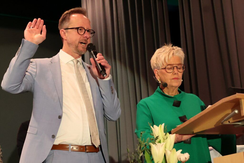 Aitrach – Der Festabend in der vollbesetzten Halle hat es bewiesen: zum Wohlfühlen zwischen Iller und Aitrach ist neu dieses Motto hinzugekommen: „Aitrach – das sind wir alle zusammen!“ Ihren Bürgermeister Thomas Kellenberger haben fast alle Wähler (99,6 Prozent) in die dritte Amtszeit gewählt. Die Vereidigung vor dem auf der Bühne vollständig angetretenen Gemeinderatsmitgliedern hat Carla Mayer vorgenommen: „Sprechen Sie mir nach …“