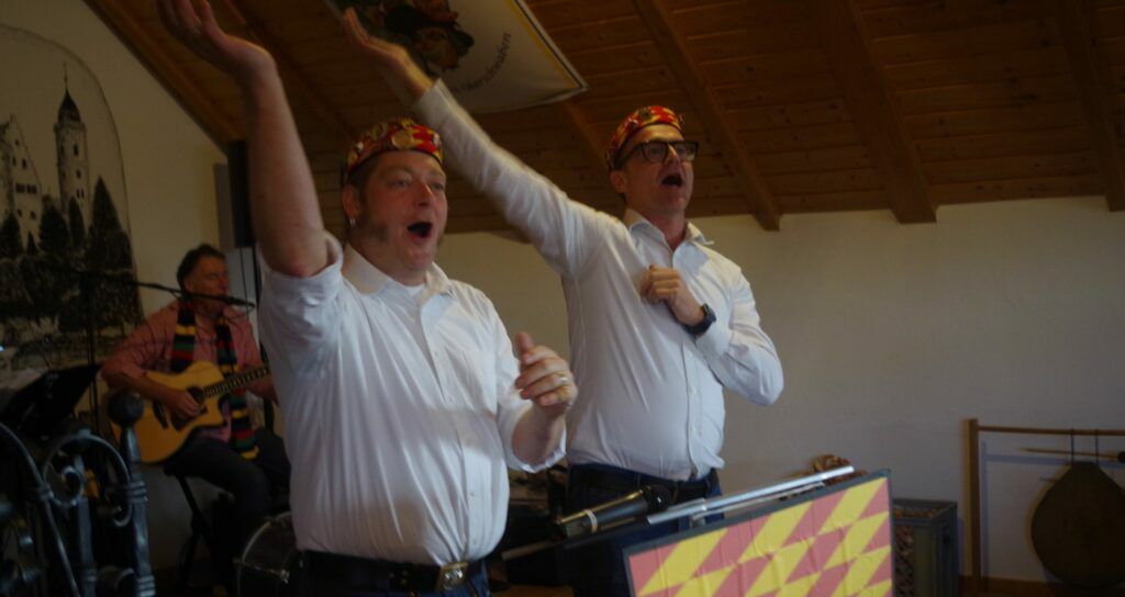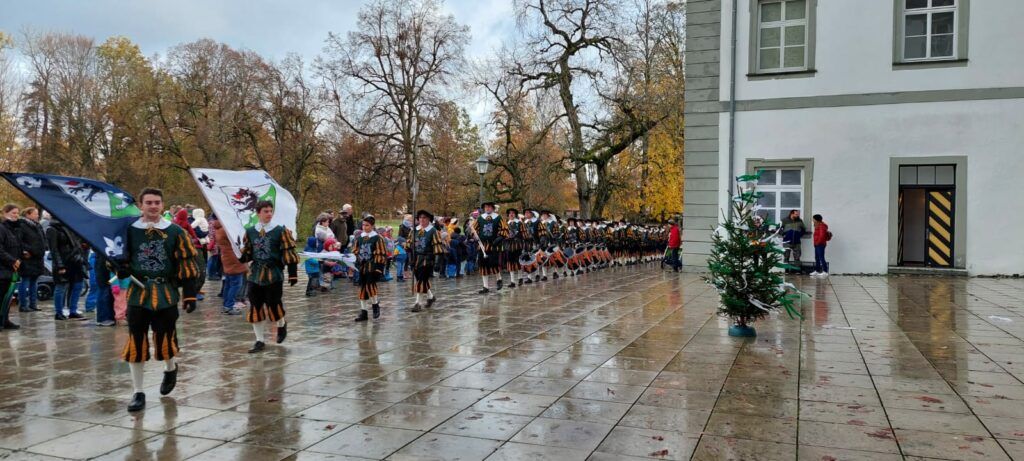Kisslegg – Pünktlich um 11.11 Uhr am 11.11. marschierte der Fanfarenzug der Kolpingsfamilie Kißlegg zum Narrenbaumsetzen mit der Narrenzunft Kißlegg vor dem Neuen Schloss ein.