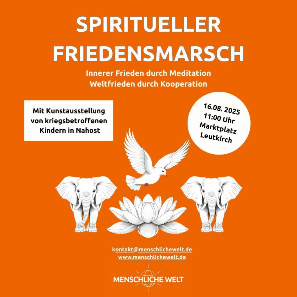 Die Veranstaltung begann um 11.00 Uhr auf dem Marktplatz in Leutkirch und bot neben der Meditation auch Raum für Begegnung und Austausch. Interessierte konnten sich über die Website www.menschlichewelt.de oder per E-Mail an kontakt@menschlichewelt.deweiter informieren und sich mit der Bewegung Menschliche Welt vernetzen. Der Spirituelle Friedensmarsch war nicht nur ein lokales Ereignis, sondern ein kraftvolles Zeichen für die Möglichkeit, durch innere Transformation zu einer friedlicheren Welt beizutragen.