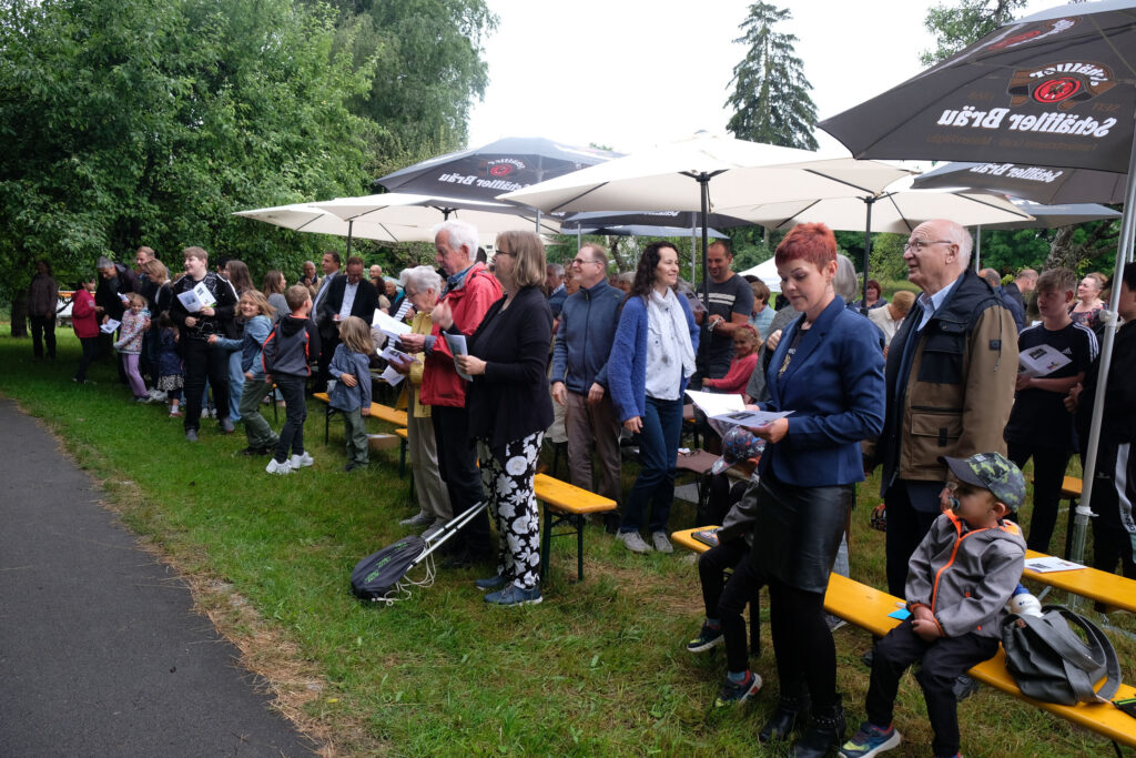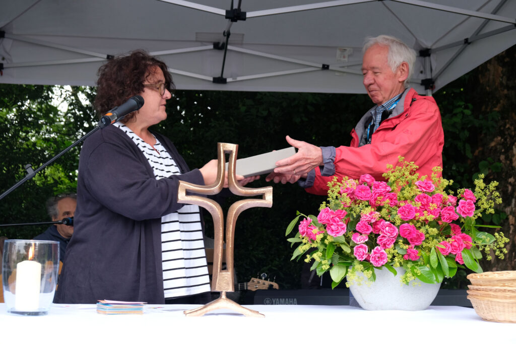 Obwohl es am Samstag noch tüchtig geregnet hatte, startete die Gemeinde den Tag mutig mit einem Gottesdienst im Grünen. Fleißige Gemeindemitglieder legten vorsorglich Wolldecken auf den Bierbänken bereit, und so versammelten sich dann auch zahlreiche Besucher unter dem Schutz der vielen Schirme. Es blieb trocken! Neben Prälatin Gabriele Wulz aus Ulm waren auch die ehemaligen Pfarrer Gerd Scheerer, Peter Huhn und Christoph Stolz gekommen sowie Vertreter und Vertreterinnen der Verbundkirchengemeinde aus Leutkirch und Kißlegg, der katholischen und der bürgerlichen Gemeinde. Dekan Dr. Martin Hauff stieß am Nachmittag noch zur Festgesellschaft.