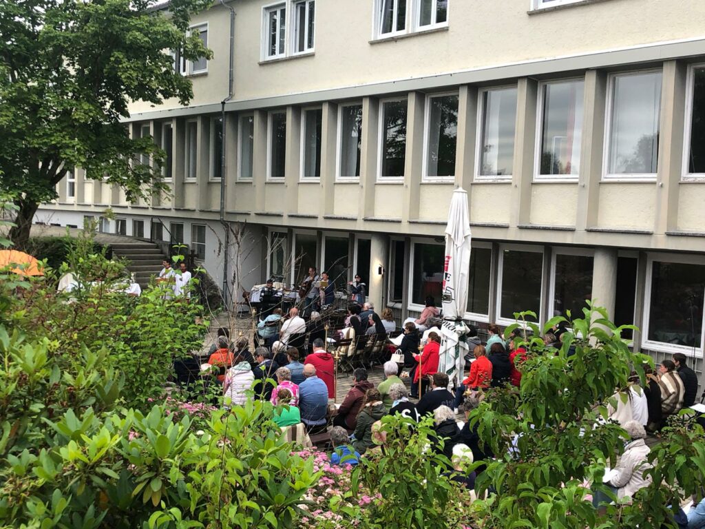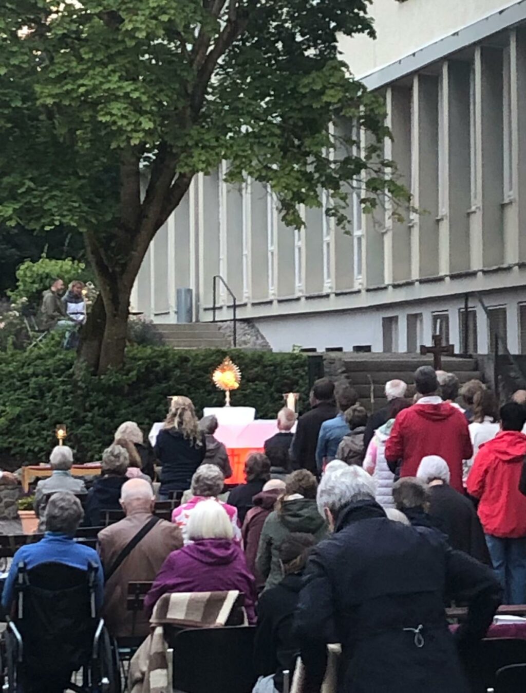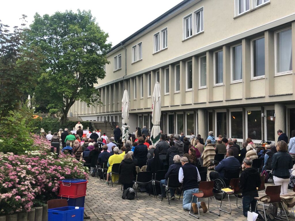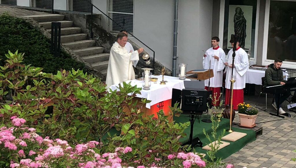 Jeden Monat am 13., am Fatima-Tag findet der sogenannte Gebetsabend im Regina Pacis statt. Im Juli wird er immer als Open-Air gefeiert. Das lockte besonders viele Besucher aus Nah und Fern. Mehr als 150 Gläubige genossen den lauen Sommerabend beim Gottesdienst und den anschließenden Heilungsgebeten inklusive besonders schöner Live-Musik eines Ensembles mit Gesang.