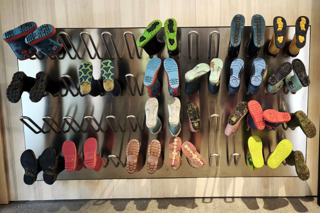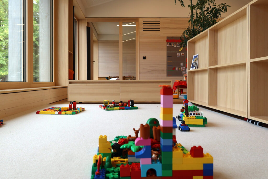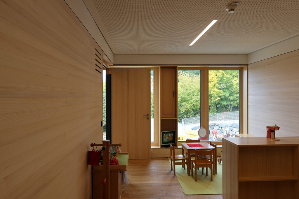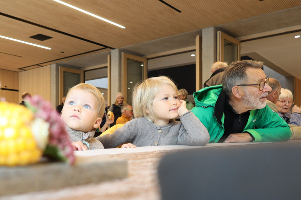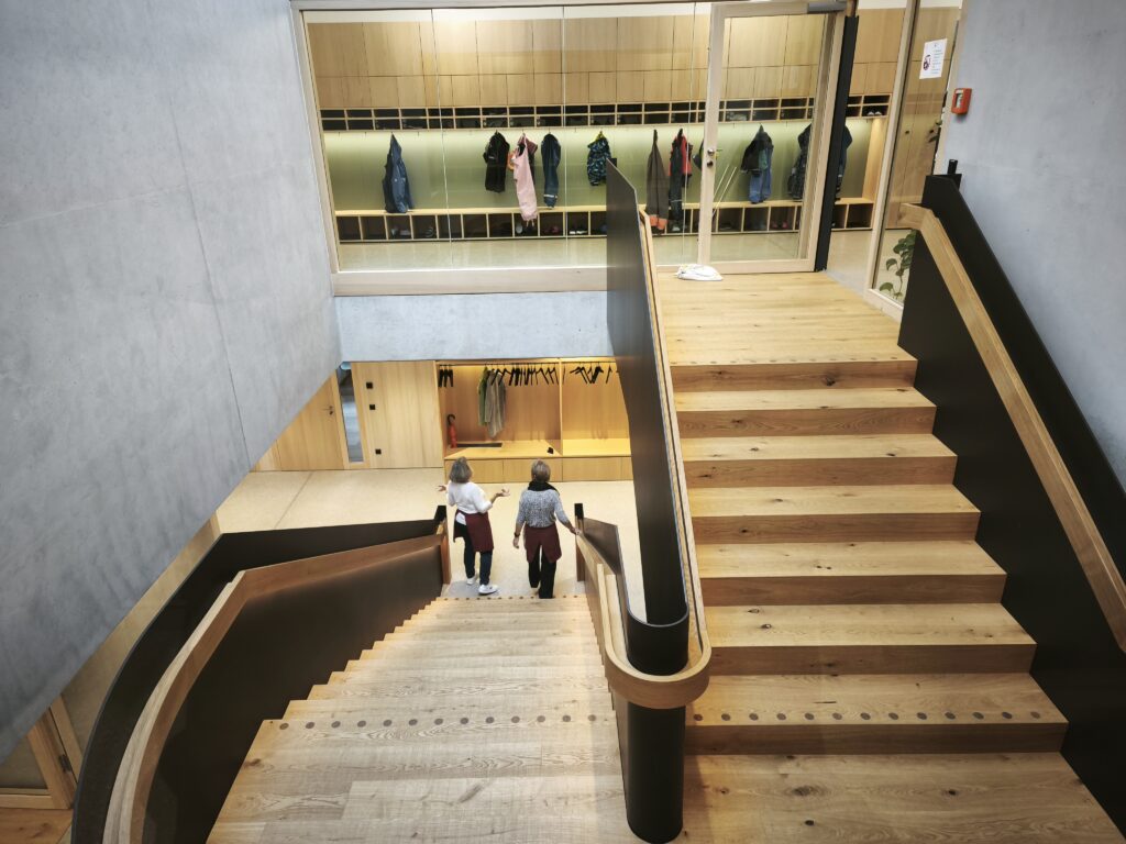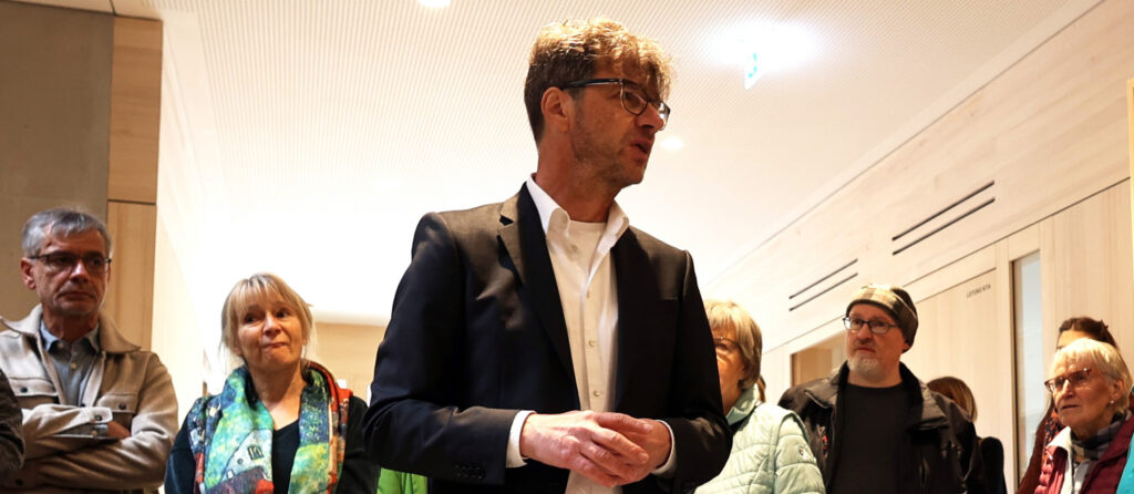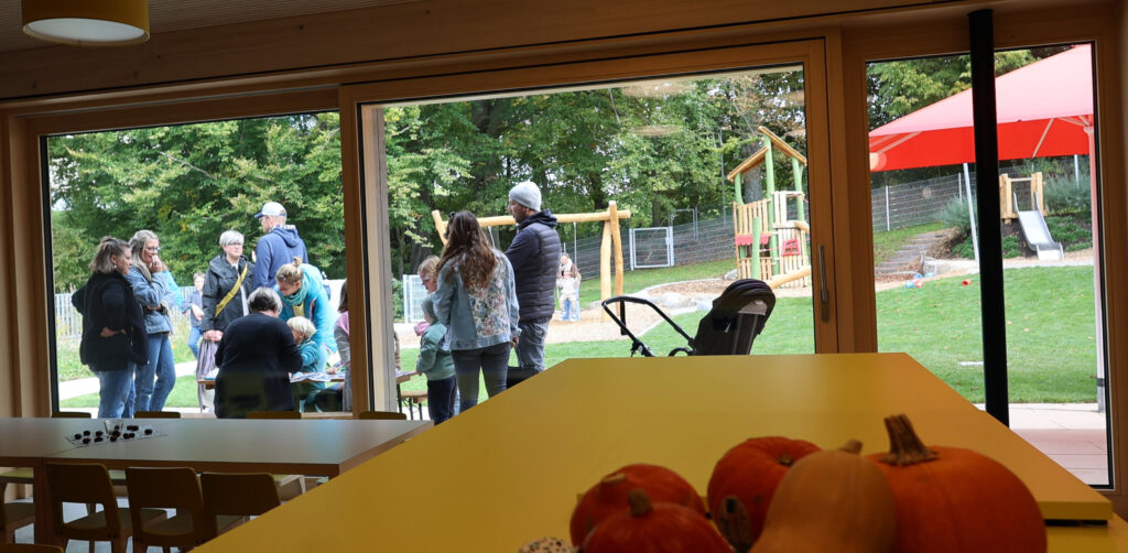 Holz dominiert das Gebäude, die Kinder lernen daran Achtsamkeit im Umgang mit natürlichem Material, erklärte Architekt Gerhard Feuerstein. Bei einem Rundgang hat er den Interessierten noch viele Details zur Entwurfsgeschichte und zur Haustechnik geschildert. Die Bohrung für die Erdwärme geht 140 Meter in die Tiefe. So sind im Fußboden sieben Kilometer Leitungen zum Heizen verlegt und damit kann auch gekühlt werden.