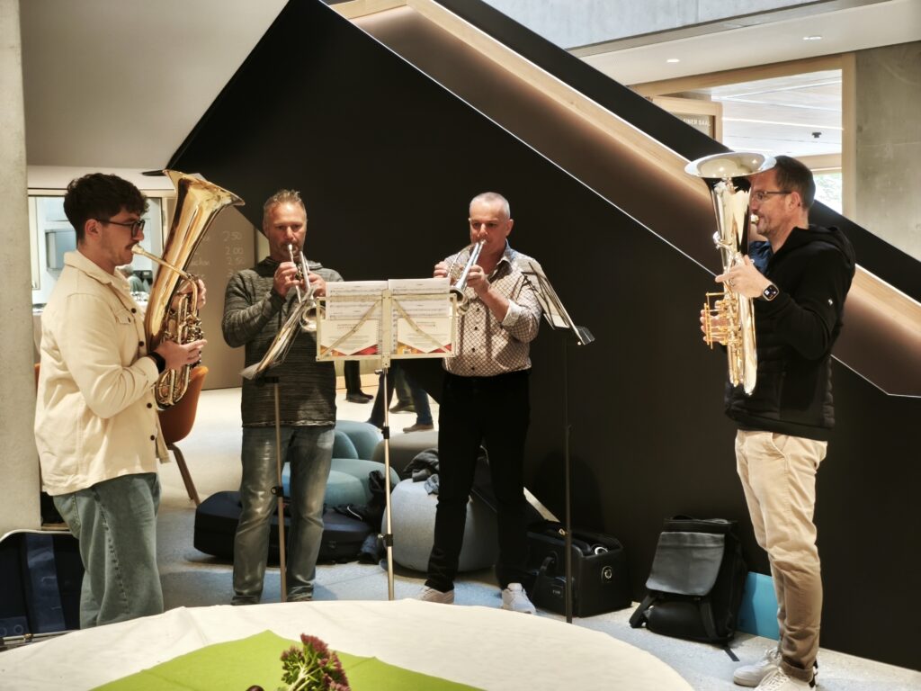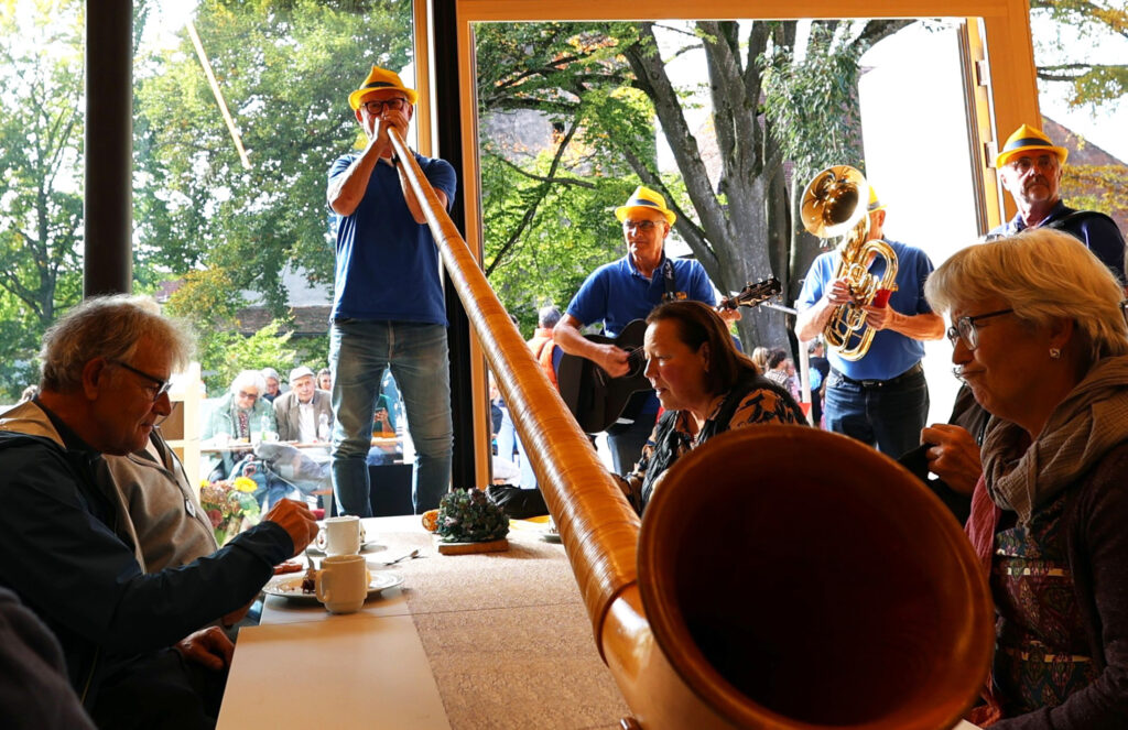 Franz Wandinger mit seinem Alphorn. Rechts seine Musikantenfreunde.