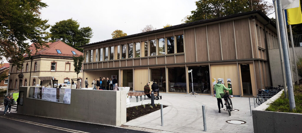Leutkirch – Das „Großer Gott, wir loben dich“ kam aus den Herzen der zahlreichen Menschen bei der feierlichen Einweihung des neuen Leutehauses am Oberen Graben. Vor fünf Jahren hatte man mit den Planungen begonnen, vor zwei Jahren mit den Bauarbeiten. Am vergangenen Sonntag (12.10.) wurde es eingeweiht. Dazu kam Weihbischof Matthäus Karrer aus Rottenburg. Gekostet hat das architektonisch und funktional anspruchsvolle Gebäude 7 Millionen Euro. Die Stadt trägt 80 Prozent der Kosten des integrierten Kindergartens und würdigt damit die pädagogische Leistung der Kirchengemeinde. Zum Kita-Bau schießt die Kirche also 20 Prozent zu – und stellt zudem das Grundstück. Gemeindesaal und Familienzentrum gehen auf Kirchenkosten (Anm. d. DBSZ-Red.: In der ersten Fassung dieses Artikels hatten wir den 80-Prozent-Zuschuss der Stadt auf das Gesamtgebäude bezogen und damit deutlich zu hoch angesetzt).