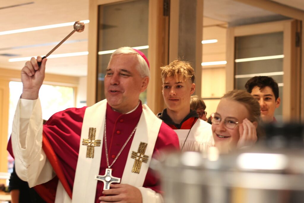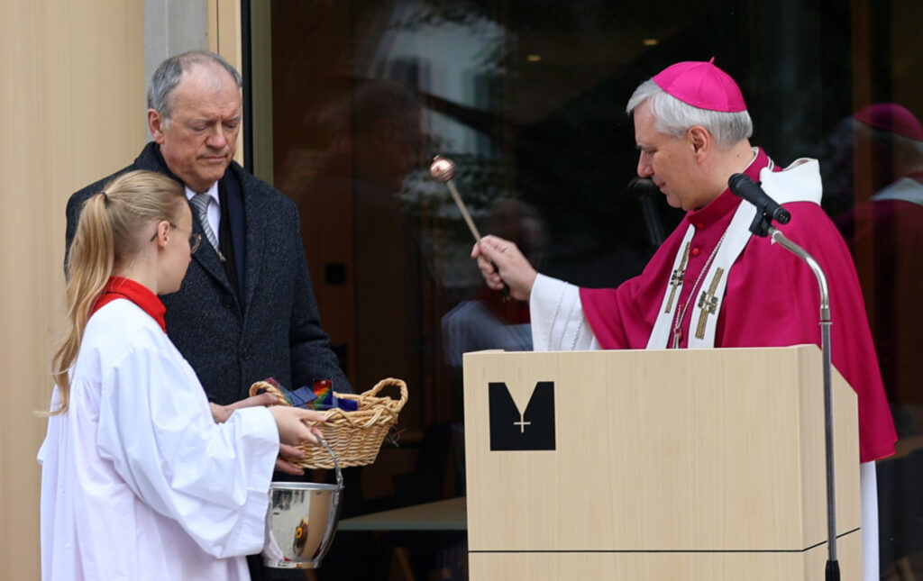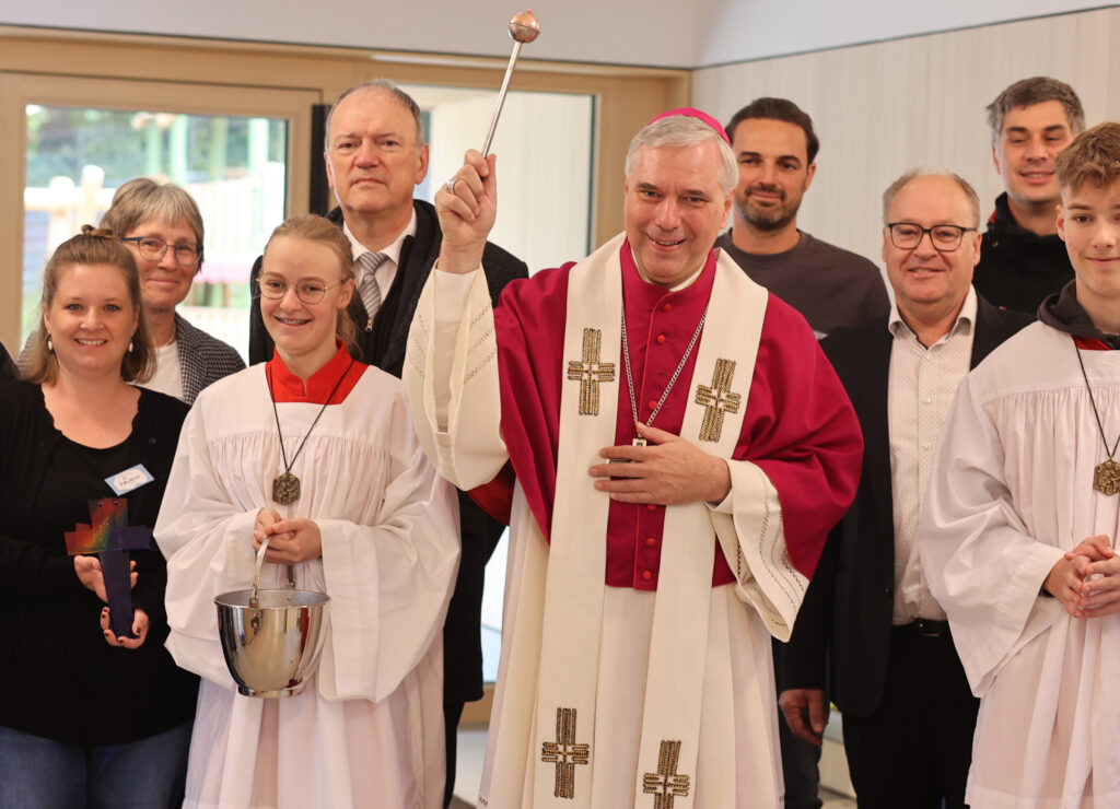 „Kinder sind immer wieder in der Bibel erwähnt“ und so sei es folgerichtig, dass heute für sie gut gesorgt wird, sagte Weihbischof Karrer. Gute Tradition sei es auch, durch ein neues Haus mit Weihrauch und Weihwasser zu gehen und es zu segnen. „Erfüllen Sie es mit Leben, es muss 24/7 bespielbar sein.“ Vor dem Rundgang jedoch diese Vorsichtsmaßnahme: „Aber den Weihrauch nehmen wir nicht mit rein, sonst kommt die Feuerwehr!“