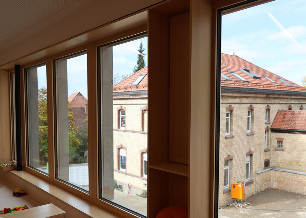 Projektleiter Christof Janz – er ist der Gewählte Vorsitzende der Kirchengemeinde – blickte auf die vor fünf Jahren getroffene Entscheidung: „Aus drei Häusern eins machen, offen für die Stadt sein, ein Leutehaus bauen“ – das sei die Zielsetzung gewesen. Platz ist nun auf 650 Quadratmetern für den Kindergarten im Obergeschoss und ein Familienzentrum und Gemeindehaus im Erdgeschoß. Der Ausblick durch die großen Glasfenster geht in die Altstadt, rückwärtig ist die Wilhelmshöhe und für die Kinder ein Spielplatz.