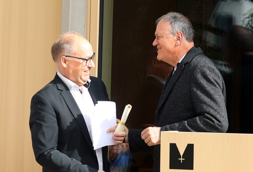 Pfarrer Karl Erzberger (rechts) dankt Christof Janz, der sich als Bauleiter von Seiten der Kirchengemeinde jahrelang um das Projekt gekümmert hat.