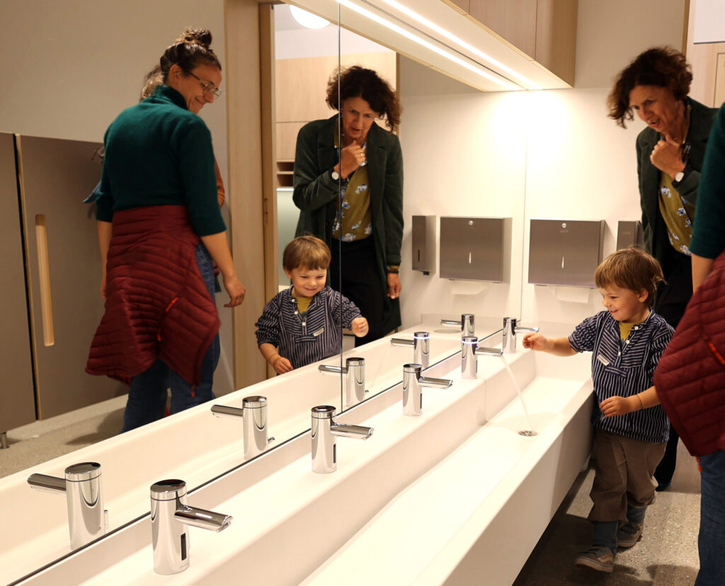 Die Wasserhahnen werden bestaunt und gleich ausprobiert.