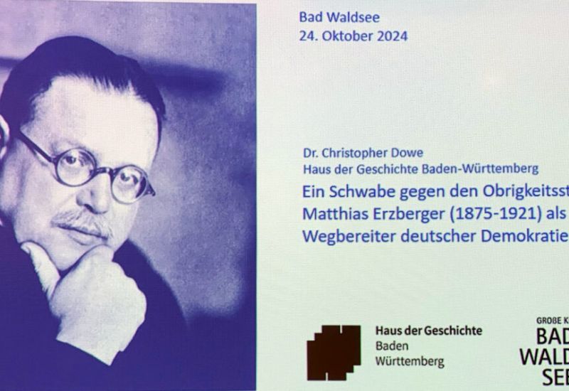 Bad Waldsee – Das Stadtarchiv Bad Waldsee unter der Leitung von Michael Tassilo Wild lud im Rahmen seiner diesjährigen Vortragsreihe den Historiker Dr. Christopher Dowe vom Haus der Geschichte Baden-Württembergs in Stuttgart zu einem Vortrag über das Wirken Matthias Erzbergers in Süddeutschland und im gesamten damaligen Deutschen Reich ein. Wild freute sich bei seiner Begrüßung über eine den gesamten Vortragsraum füllende Besucherschar, stellte Dowe kurz vor und bat ihn ums Wort.