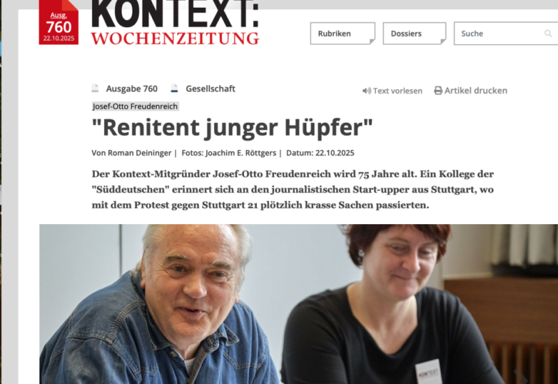 Bad Waldsee / Stuttgart – Josef-Otto Freudenreich, aus Bad Waldsee stammender Journalist, hat es jenseits seines heimeligen Städtchens weit gebracht: Er wurde Chefreporter der „Stuttgarter Zeitung“ und klopfte mit seinem Schreibstift den Mächtigen auf die Finger. Jetzt ist der Unbeugsame 75 geworden. Und nach wie vor mit seiner linksalternativen Internetzeitung „KONTEXT“ kritisch unterwegs.