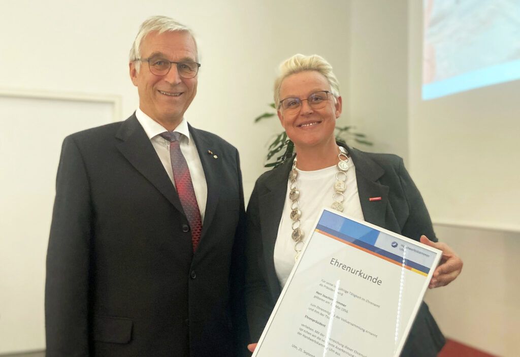 Ulm / Leutkirch – Im Rahmen der jüngsten Vollversammlung der Handwerkskammer Ulm wurden die beiden ehemaligen Mitglieder des Präsidiums, Joachim Krimmer und Wilfried Pfeffer, für ihr Engagement und das bekleidete Ehrenamt für die Handwerkskammer Ulm mit der Ehrenpräsidentschaft ausgezeichnet.