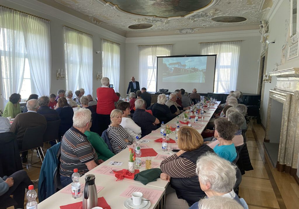 Kißlegg – Donnerstagnachmittag, 11. April, kurz nach 14.30 im Bankettsaal des Neuen Schlosses Kißlegg. Trotz vergleichsweise warmer Vorfrühlingssonne sorgen rund 80 meist nicht mehr ganz junge Besucherinnen und Besucher für einen rappelvollen Vortragsraum bei diesem Altennachmittag. Mitveranstalterin Margret Kehle (Bild) kündigt am Mikrofon freudig Dr. Eberhard Fritz als Redner an. Sein Thema: Geschichte der Eisenbahn/Geschichte der Eisenbahn in und um Kisslegg.