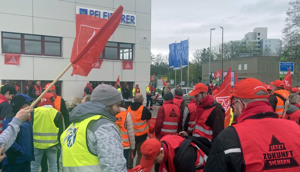 Leutkirch – Dienstag, 9. April, kurz nach 13.00 Uhr vor der “Pfleiderer”-Porte an der Wurzacher Straße. Die IG Metall hat zum Warnstreik aufgerufen. Und über 200 Beschäftigte (laut Gewerkschaftsangaben) versammeln sich dort. Sie fordern 9,9 % mehr Lohn und eine “überproportionale Anhebung der Ausbildungsvergütungen”. Laute Musik und ein bewegtes Fahnen-Meer zeigen die Entschlossenheit der Arbeiter. Einfahrende LKWs und manches Auto auf der Wurzacher Straße hupen zustimmend.