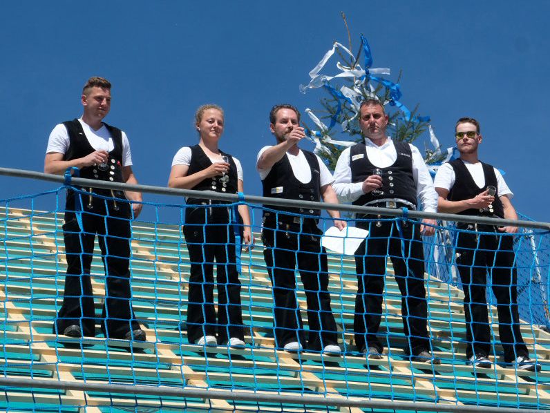 Eintürnen – Bürgermeisterin Alexandra Scherer und Ortsvorsteher Berthold Leupolz freuten sich, beim Richtfest für das neue Feuerwehrhaus in Eintürnen Vertreter des Architekturbüros, des Stadtbauamtes, der Feuerwehr Bad Wurzach und der beteiligten Baufirmen Kutter und Holzbau Krusch begrüßen zu können.