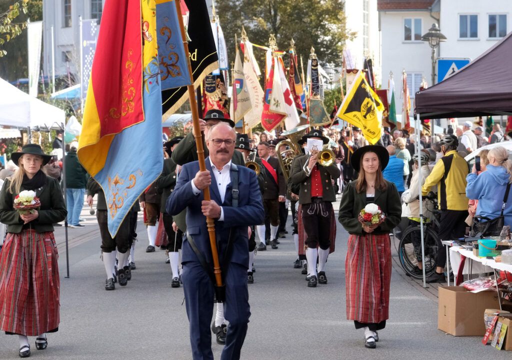 Bad Wurzach – Es war ein beeindruckender Zug der Vereine, die mit ihren Fahnen am Sonntag (12.10) vom Rathaus zur Kirche und zurück zogen und danach bei der Bühne am Rathaus sich vor dem Hintergrund des Schlosses postierten. Mit der Stadtfahne, getragen von Heinrich Vincon an der Spitze. Die Vereine waren ausgerückt aus Anlass des Festes „50 Jahre Eingemeindung”. Das Jubiläumsfest war verbunden mit einem verkaufsoffenen Sonntag. Der „Wurzacher” wird darüber noch ausführlich berichten.