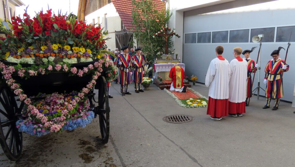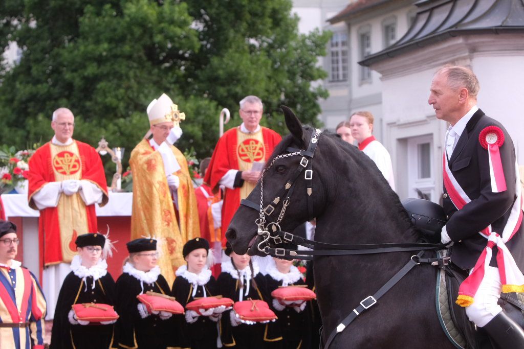 Bad Wurzach – Diözesanbischof Klaus Krämer betonte es bei der Feier des Pontifikalamtes nach dem Blutritt: Es war auch für ihn etwas ganz Besonderes, dieses Glaubensfest mit der sehr großen Zahl an Gläubigen zu feiern, und das im noch von Papst Franziskus ausgerufenen Heiligen Jahr. Auch für Stadtpfarrer Stefan Maier war es etwas ganz Besonderes: Er, der sonst in jedem Jahr selbst mitritt, hatte aufgrund seiner im Winter erlittenen Fußverletzung erstmals die Gelegenheit, selbst im Heiligblutwagen mitzufahren und mit dem Reliquienkreuz die Fluren zu segnen und an den Außenaltären am Josenhof, in Truschwende und am Reinstein den Segen zu spenden. Auch heuer war der Heiligblutwagen wieder toll geschmückt – diese Besonderheit ist freilich eine regelmäßig wiederkehrende Sensation. 64 Reitergruppen mit an die 1000 Pferden verehrten das Heilige Blut. Begleitet wurden sie von 29 Musikkapellen. Die Gesamtorganisation lag in den Händen von Klaus Schütt.