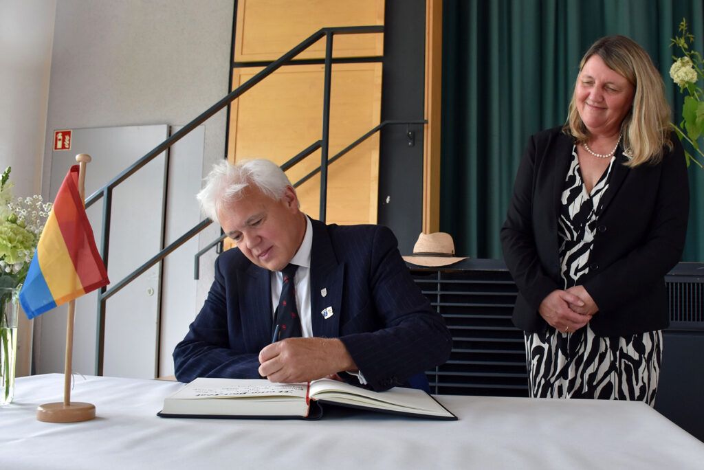 Bad Wurzach – Wie es seit langem guter Brauch ist, gibt es zum Auftakt des Heiligblutfestes ein Frühstück für geladene Gäste. In diesem Rahmen übergab Bürgermeister Simon Crowcroft (St. Helier, Jersey) an Bürgermeisterin Alexandra Scherer ein Geschenk. Und Deputy Bailiff Mr. Robert MacRae, der erstmals in Bad Wurzach weilt, trug sich ins Goldene Buch der Stadt ein.