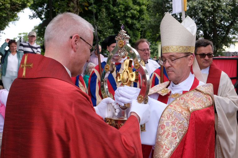 Bad Wurzach – Die große Mulde unterhalb des Zelebrationszeltes und die angrenzenden Bereiche waren übervoll. So gut besucht war der Pontifikalgottesdienst beim Heiligblutfest schon lange nicht mehr. Das war zum einen dem schönen Wetter zu verdanken, vor allem aber wohl dem Umstand, dass der neue Bischof gekommen war. Gottesberg-Superior Pater Konrad Werder freute sich sehr über den hohen Besuch aus Rottenburg und sagte bei der Begrüßung sinngemäß Folgendes: