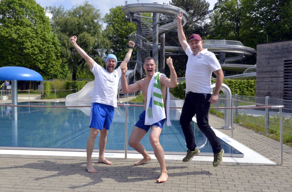 Bad Waldsee – Kurz vor der offiziellen Eröffnung am vergangenen Samstag (10.5.) haben Oberbürgermeister Matthias Henne und Fachbereichsleiter Axel Musch den ultimativen Wassertest gemacht – Sprung ins rund 21 Grad warme Nass! Unter den wachsamen Augen von Freibadleiter Marc Steiner: bestanden! Übrigens: Das Wasser wird umweltfreundlich mit Solar- und Nahwärme der Stadtwerke beheizt.