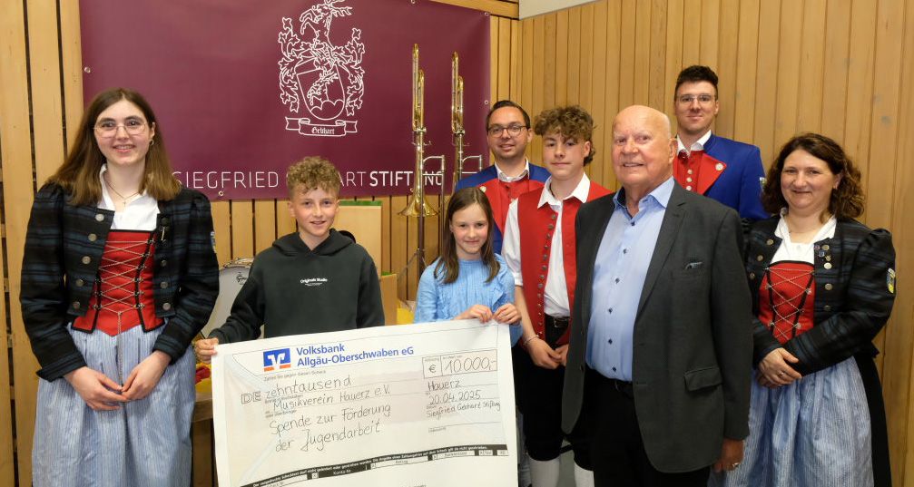 Hauerz – Nachdem die letzten Töne der „Serenade“ von Joseph Haydn beim diesjährigen ganz außerordentlichen Osterkonzert des Musikvereins Hauerz verklungen waren, war es an Vorstandsmitglied Ingrid Ritscher, Dank zu sagen an die Adresse eines besonderen Ehrengastes. Denn nach diesem ganz besonderen Konzertabend mit Peter Schad als Dirigenten war die Übergabe einer namhaften Spende für die Nachwuchsarbeit des Vereines aus den Händen des Stifters höchstpersönlich der Höhepunkt des Abends: Nicht weniger als 10.000 € wendete die Siegfried-Gebhart-Stiftung dem Förderverein der Hauerzer Musiker zu!
