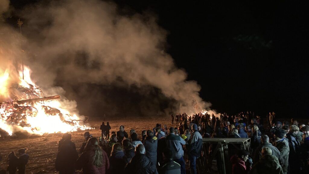 Oberschwarzach – Bei strahlendem Sonnenschein konnten die Hobbyzieher Oberschwarzach am Samstag den großen Funken in Schönbuch aufbauen. Auch am Abend war das Wetter traumhaft, warm, windstill und trocken. Mehrere Hundert Besucher strömten am Abend auf abgetrockneten Acker, um das große Funkenfeuer zu bestaunen.