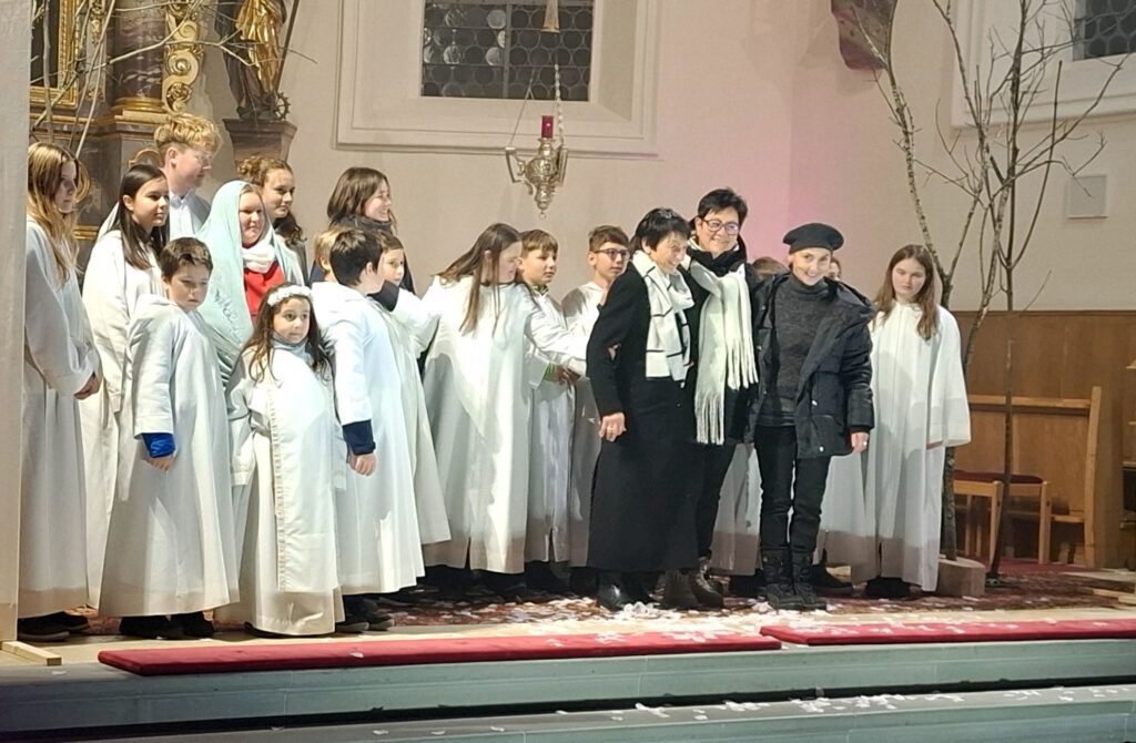 Gebrazhofen – „Gaudete! Sie dürfen sich freuen auf eine Weile der Stille, der Dunkelheit, Besinnlichkeit und des intensiven Erlebens.“ Mit diesen Worten begrüßte Elisabeth Sauterleute die Zuschauerinnen und Zuschauer, die sich am dritten Adventssonntag in der katholischen Kirche „Mariä Himmelfahrt“ in Gebrazhofen eingefunden hatten. „Mit unserer Advents-Performance gestalten wir die Themen der vier Adventssonntage und machen die Transzendenz, die der Adventszeit eigen ist, sinnlich erfahrbar“, erklärte die Leiterin der Leutkircher Kunstschule. In Kooperation mit Organistin Rita Buchner und einer Gruppe von mitwirkenden Kindern und Jugendlichen entstand eine sehr persönliche, ausdrucksstarke Interpretation der Adventsbotschaft.