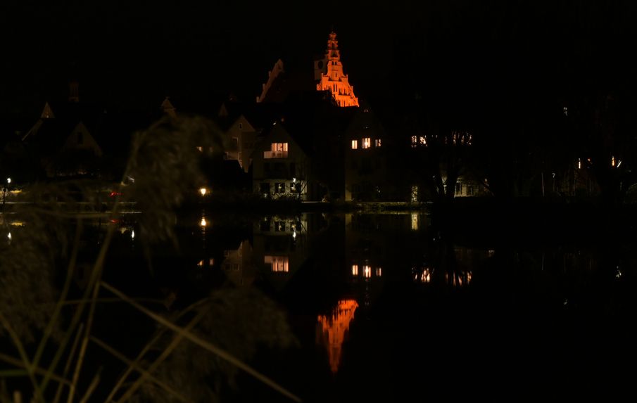 Das Bad Waldseer Rathaus war in der Nacht vom 25. auf den 26. November in orangefarbenes Licht getaucht. Der 25. November ist der Internationale Tag gegen Gewalt an Frauen – gemeinhin als Orange-Day bezeichnet. Die Aufnahme hat unser Reporter Erwin Linder gemacht. Für Nicht-Waldseer: Die Illumination spiegelt sich im Bad Waldseer Stadtsee.