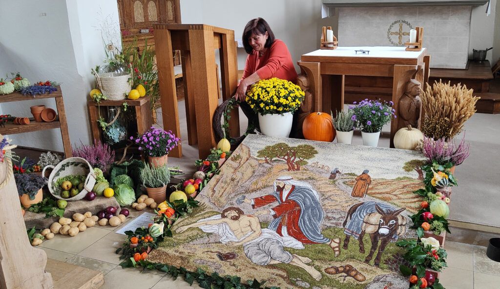 Tautenhofen – Seit 1997 gestaltet Christine Kimmerle jedes Jahr zum Erntedankfest ein Körner- und Samenbild für die Kapelle St. Silvester in Tautenhofen. Mehr als 100 Stunden investiert die Tautenhoferin, damit alle Details sehr akkurat zur Ansicht kommen. Das Bild wird dieses Jahr bis 8. Oktober in der Kapelle zu sehen sein und danach wieder für zwei Wochen in der Galluskapelle oben auf dem Winterberg ausgestellt sein.