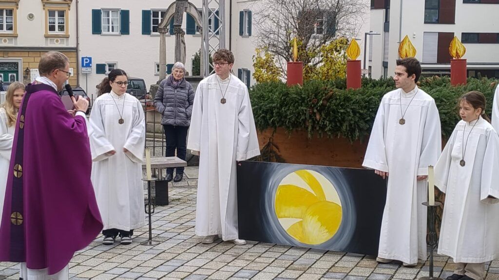 Reute – Schon im dritten Jahr hat die Solidarische Gemeinde Reute-Gaisbeuren zu einem besonderen Event aufgerufen. Am Vorabend des zweiten Adventssonntags wurden die Bewohner zu einem besinnlichen und auch kurzweiligen Innehalten eingeladen. Der Veranstaltungsort ist ungewöhnlich, die Verantwortlichen haben dazu die Aussegnungshalle des Friedhofs in Reute ausgewählt. Zwar gab es in diesem Jahr keinen Schnee, dafür regnete es leicht. Dazu blies ein ungemütlicher Wind. Dieser ließ etwa 70 Personen aber nicht davon abhalten, um 17.00 Uhr die angenehm beheizte Aussegnungshalle zu betreten.