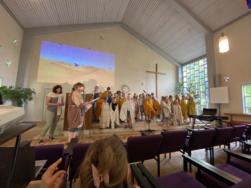 Bad Wurzach – Am Samstag, 19. Juli, haben sich 36 Kinder Bad Wurzach und Umgebung auf die Spuren des biblischen Mose begeben. Ein Team von 12 Mitarbeitenden hat für die Kinder einen vielseitigen Tag gestaltet mit Spielszenen zur biblischen Erzählung von der Offenbarung Gottes im brennenden Dornbusch und dem Auszug der Israeliten aus Ägypten. In der Großgruppe und in Kleingruppen wurde gesungen, Theater gespielt, die Geschichte erzählt, gespielt und gebastelt.