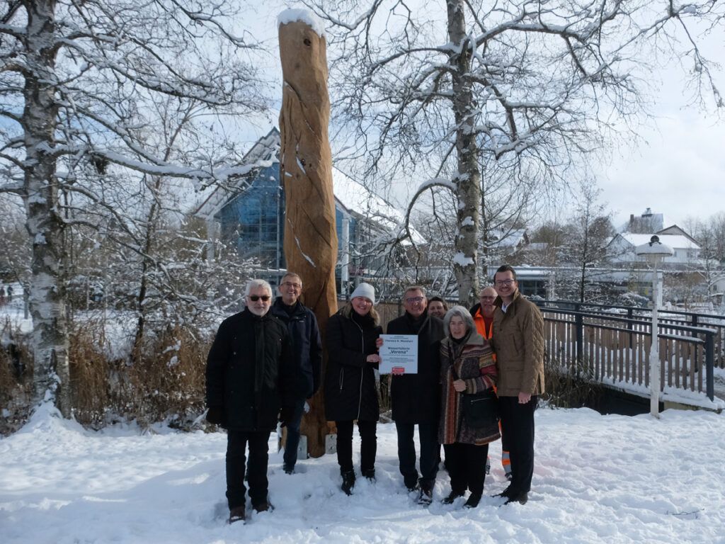 Bad Wurzach – Bei der Gemeinderatssitzung im Oktober wurde der Stadt die Skulptur als Sachspende der Kreissparkasse zur Verschönerung des Kurparks in Aussicht gestellt, nun steht die Figur der Wasserhüterin „Verena“ schon seit einigen Tagen bei der Achbrücke am Torfstecher. Zur offiziellen Übergabe trafen sich Bürgermeisterin Alexandra Scherer, Bauhofleiter Dirk Fietkau, die Künstlerin, Vertreter der Kreissparkasse und des Gemeinderates am Freitagmorgen (22.11.2024) bei der Wasserhüterin.